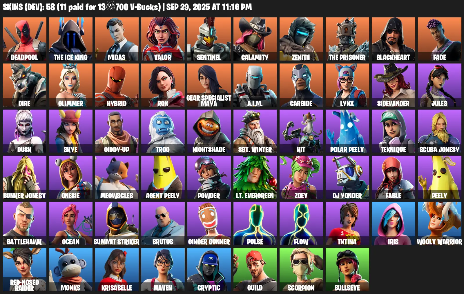 [PC/XBOX/PSN] 58 Skins | Deadpool | The Ice King | Midas | Valor | Sentinel | Calamity | Zenith | The Prisoner | Blackheart | Fade | Dire | Glimmer | Hybrid | Rox | Gear Specialist Maya | A.I.M. | Carbide | Lynx | Sidewinder | Jules | Dusk | Skye