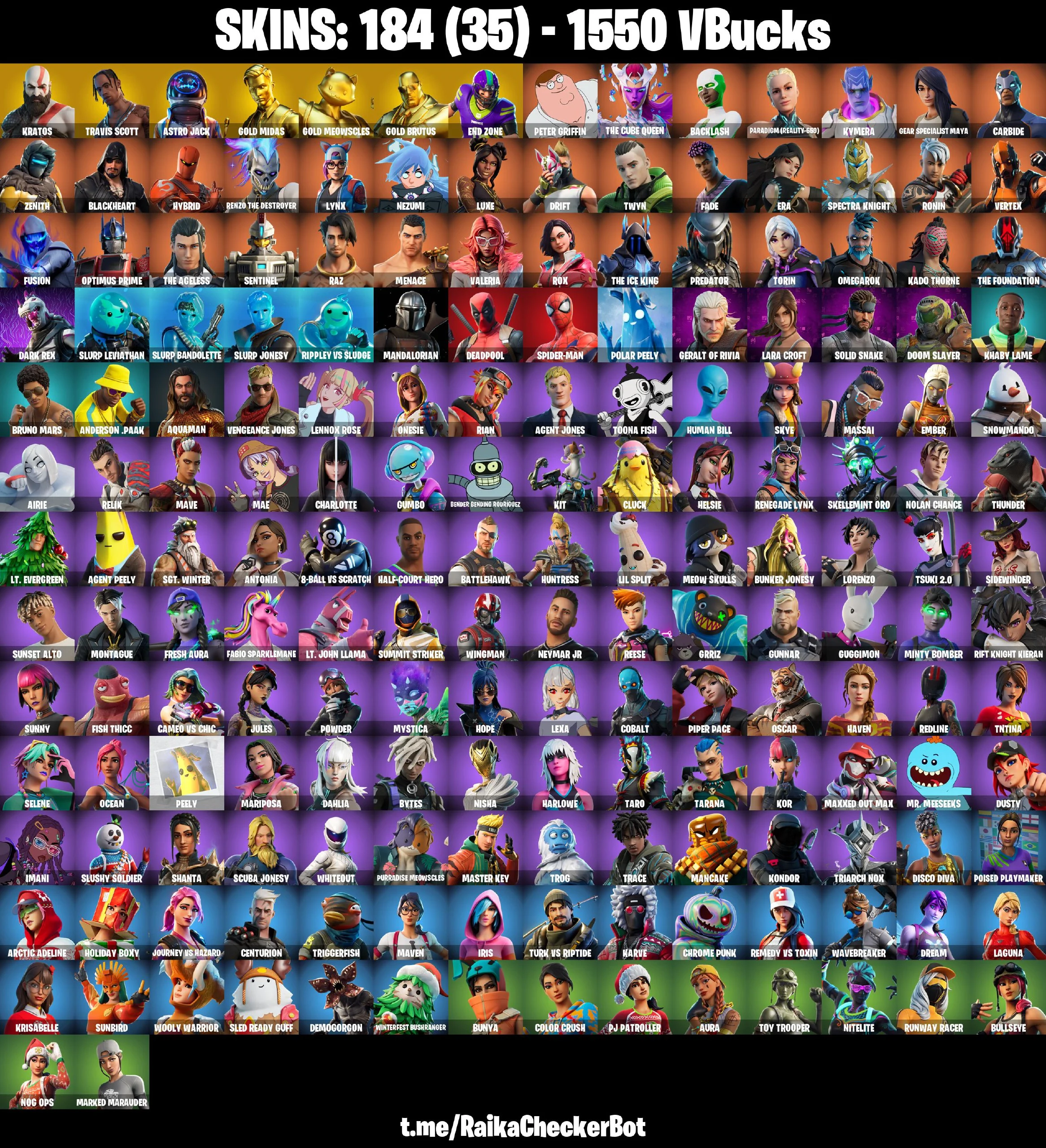 🎁✨ RARE ACCOUNT ✨🎁 184 SKINS 🌟 LEVIATHAN AXE 🌟 TRAVIS SCOTT 🌟 KRATOS 🌟 ASTRO JACK 🌟 GOLD MIDAS 🌟 GOLD MEOWSCLES 🌟 GOLD BRUTUS 🌟 END ZONE 🌟 PETER GRIFFIN 🌟 THE CUBE QUEEN 🌟 1550 VB 🌟 XBOX/PC/PSN