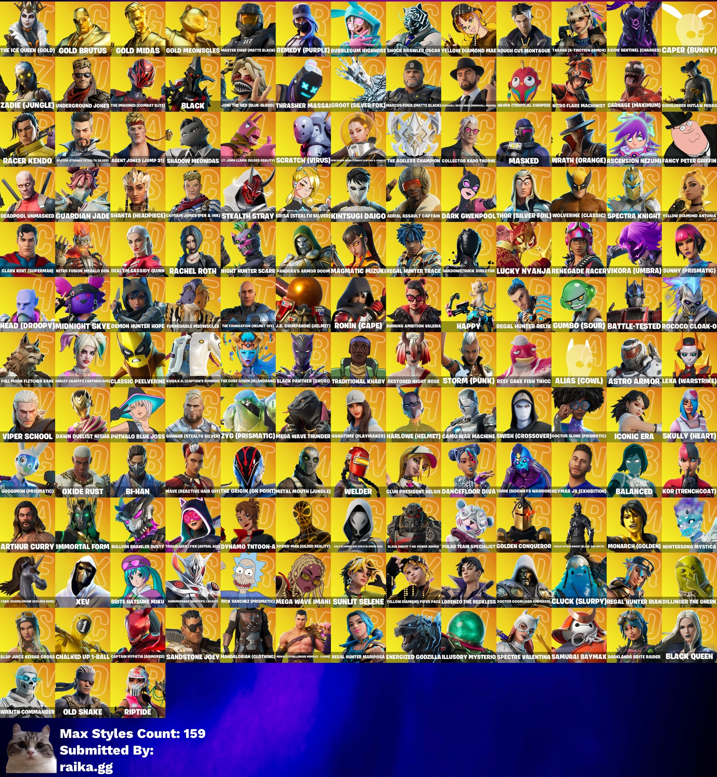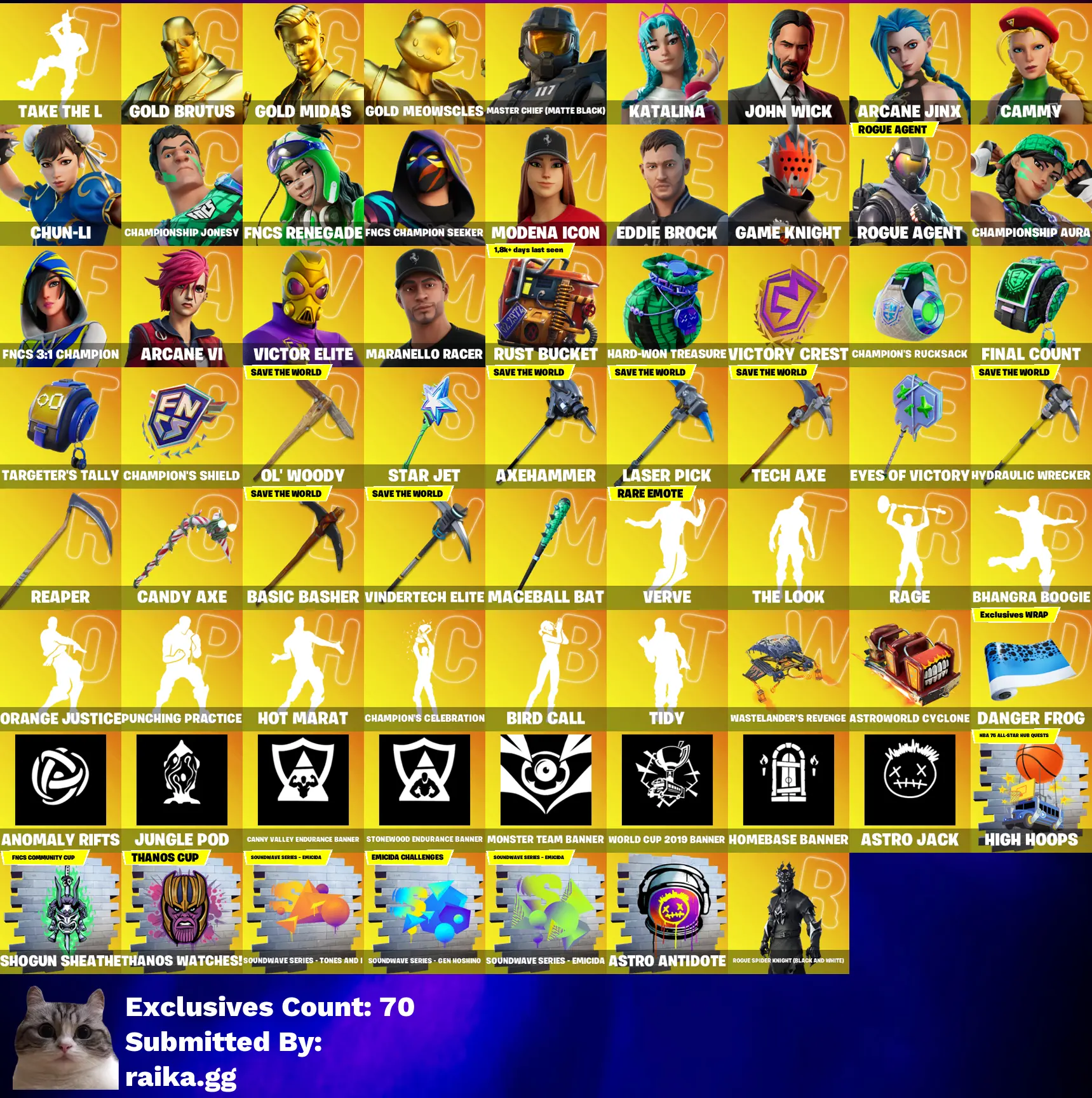 💥✅ STACKED 🔥 🖥️🎮 [PC/PSN/XBOX] 🎮 1005 Skins 🕷️ Rogue Spider Knight 💃 Take The L 🔥 Renegade Raider 🪓 Raider's Revenge 🏆 Gold Brutus 💰 Gold Meowscles 🛡️ Master Chief (Matte Black) 🕶️ John Wick 💥 Arcane Jinx 👊 Chun-Li 🏅 Championship Jonesy 💎