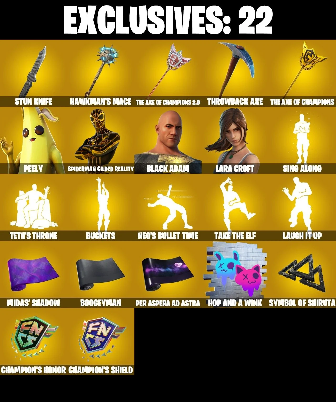 👑 SUPER STACKED 👑320 Skins 👑PC/PSN/XBOX👑 PAID EMOTES 👑 Lara Croft 👑 Marvel Skins 👑 Black Adam 👑 Buckets 👑 Neo's Bullet Time 👑 Teth's Throne 👑 Sing Along 👑 Peely 👑