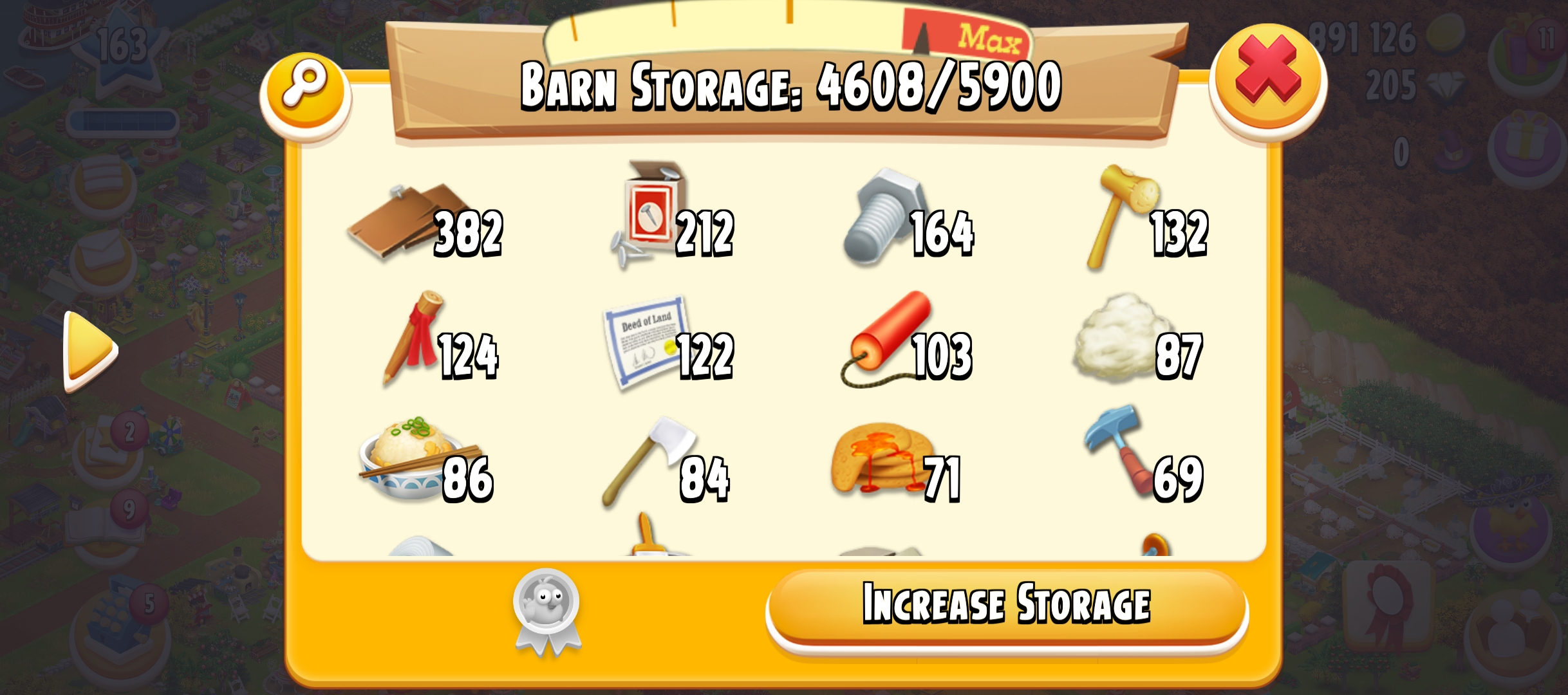 163 level | Barn Storage 5900 | Silo storage 6650 | 800k Coin | 205 gems | Android & IOS