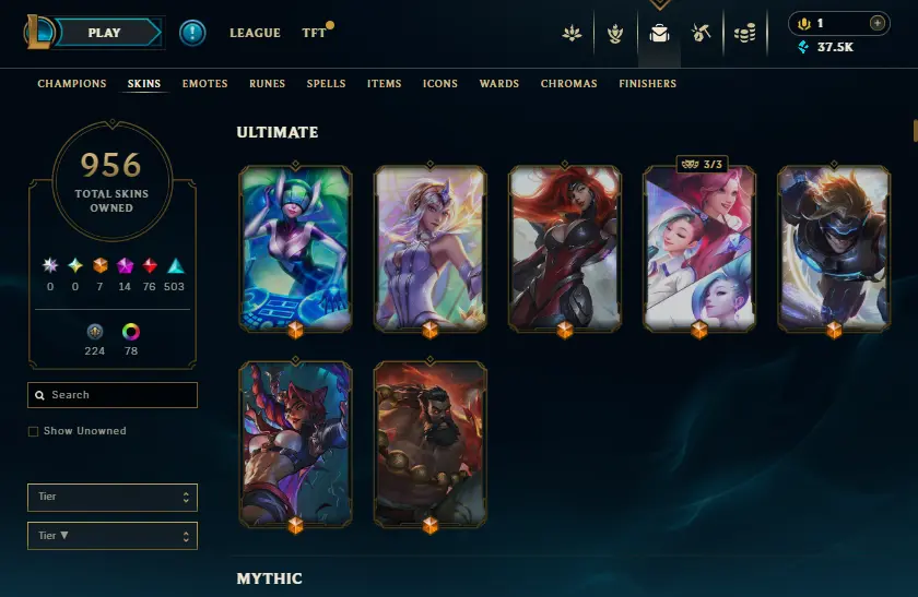 💠 [EUNE] | LVL 281 | UNRANKED LAST D1 / 🏆 S24 Split 2 Master🎭 956 Skins incl. ✨ Erasure Cosmic Jhin | 💰 37,590 BE / 1 RP🏅 Honor Level 3 | 🧠 Full Champ Roste