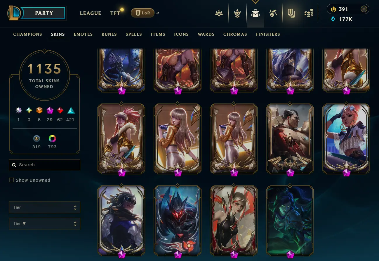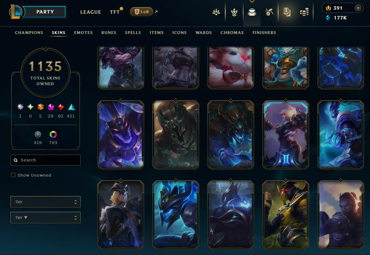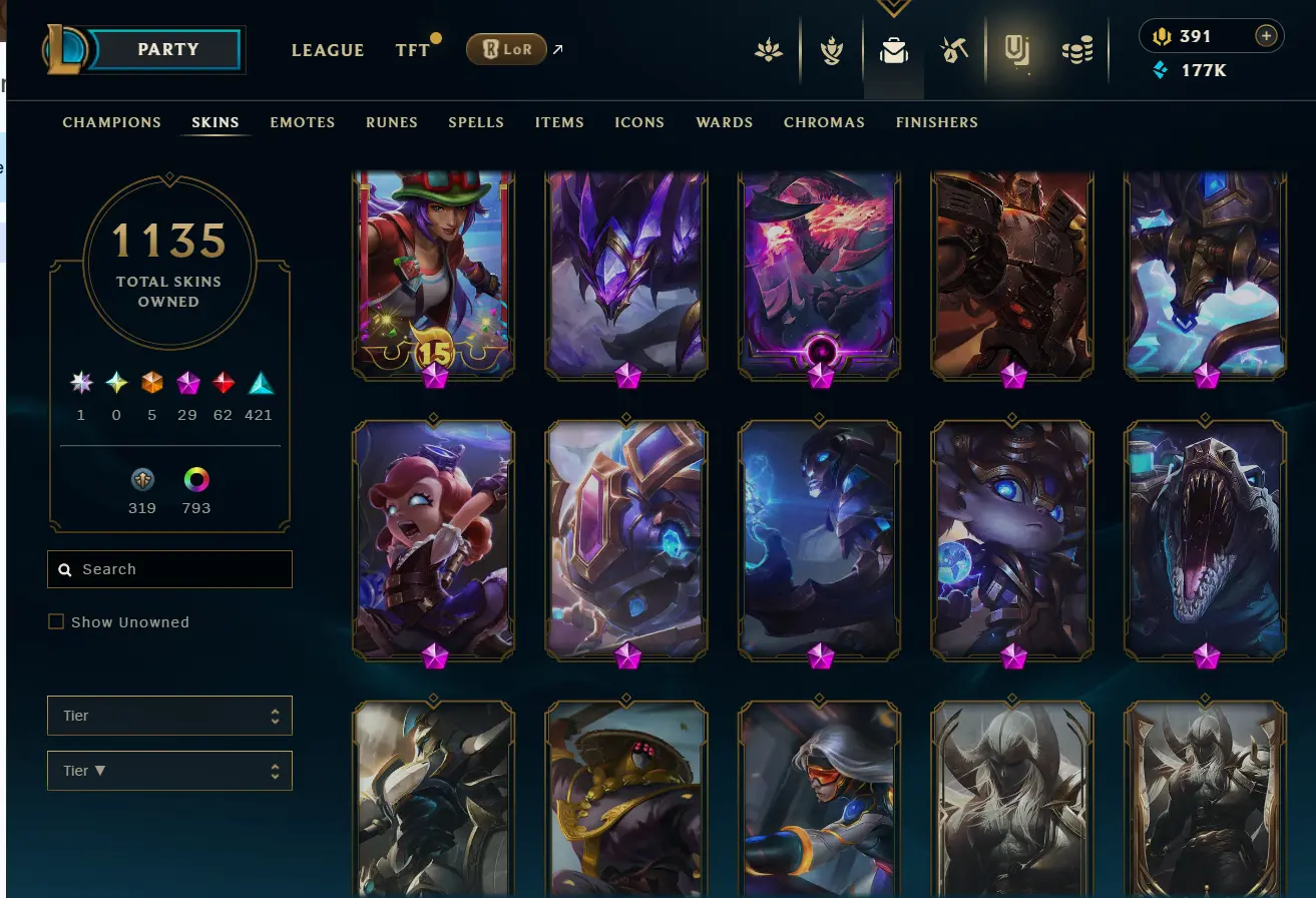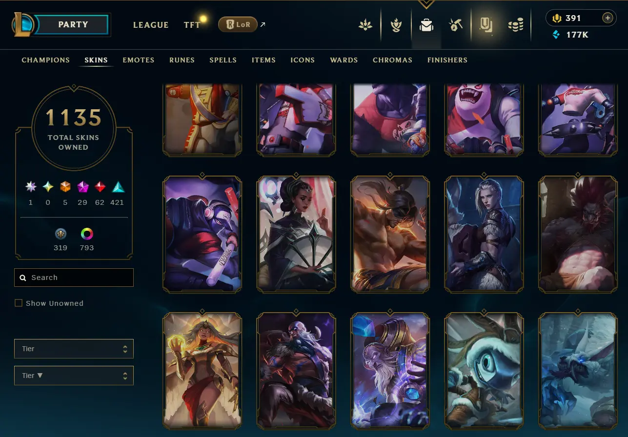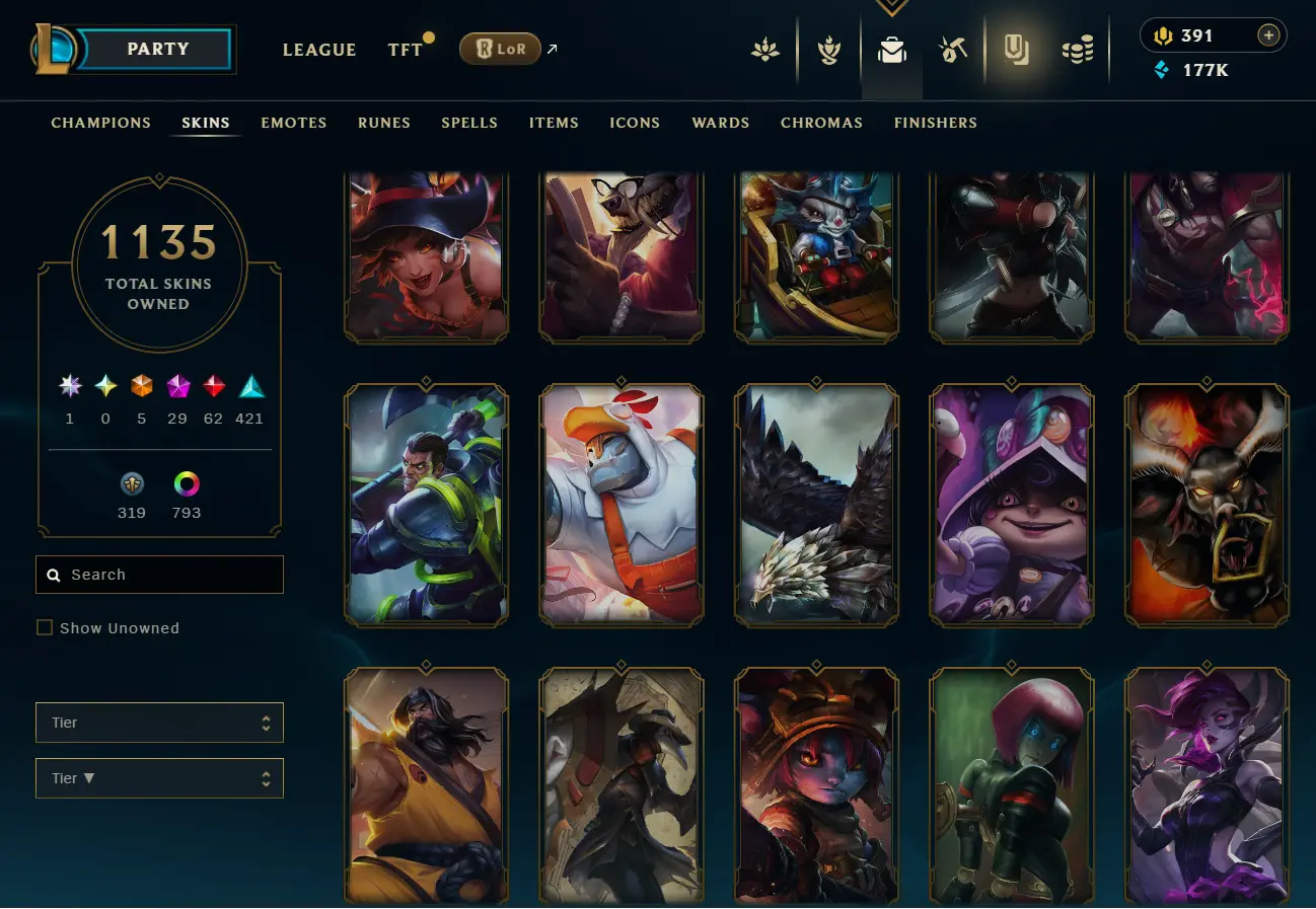 [EUW] 1135 skins ~ Quantum Galaxy Slayer Zed + Risen Legend Ahri + All Rare Skins Like: All Pax Skins + Black Alistar + Young Ryze etc + Full Rare Icons + Tft Loot