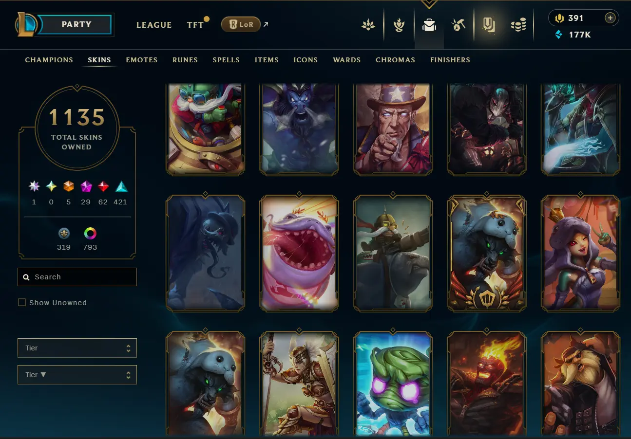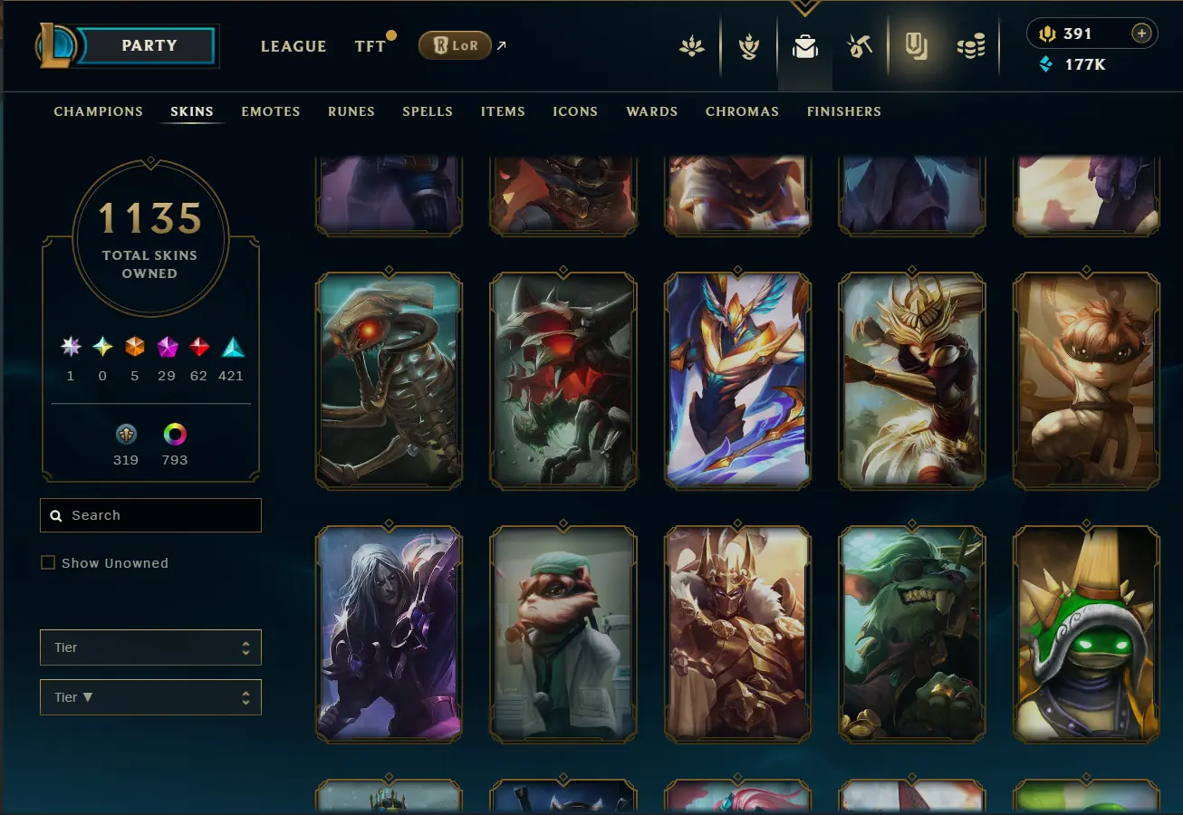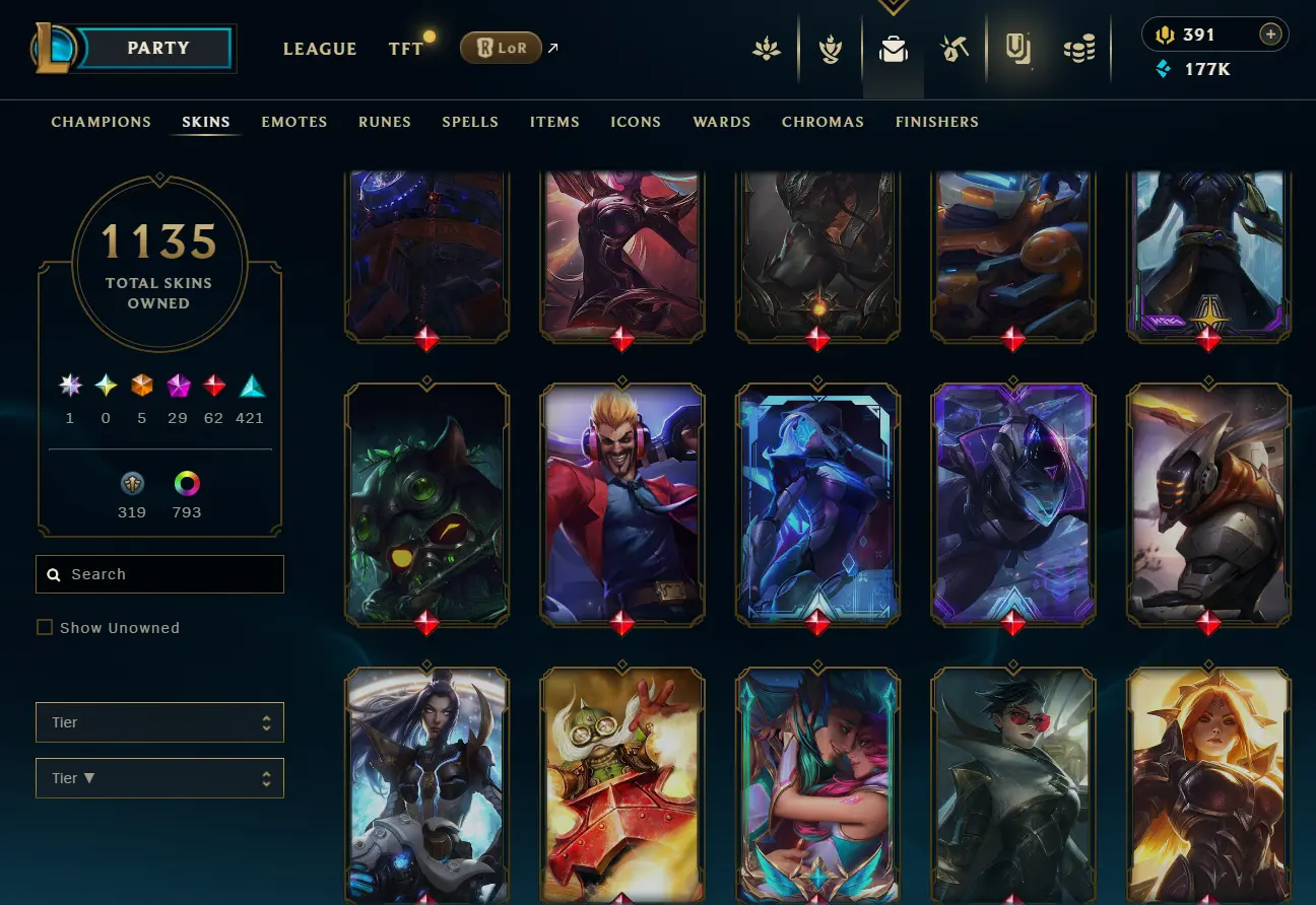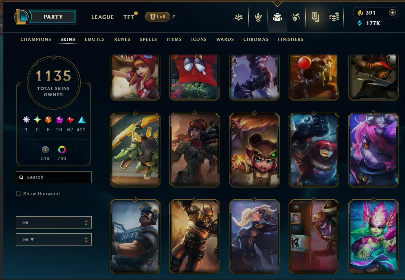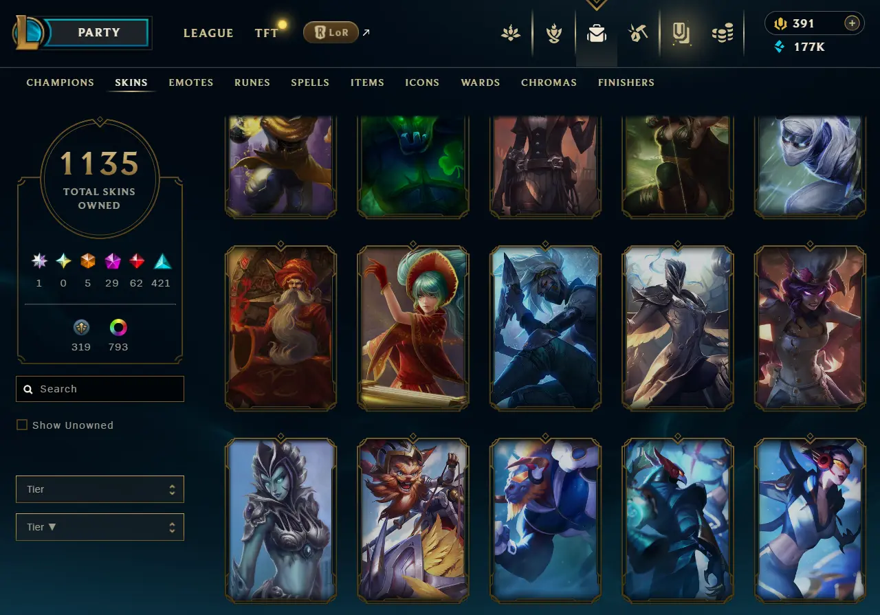 [EUW] 1135 skins ~ Quantum Galaxy Slayer Zed + Risen Legend Ahri + All Rare Skins Like: All Pax Skins + Black Alistar + Young Ryze etc + Full Rare Icons + Tft Loot