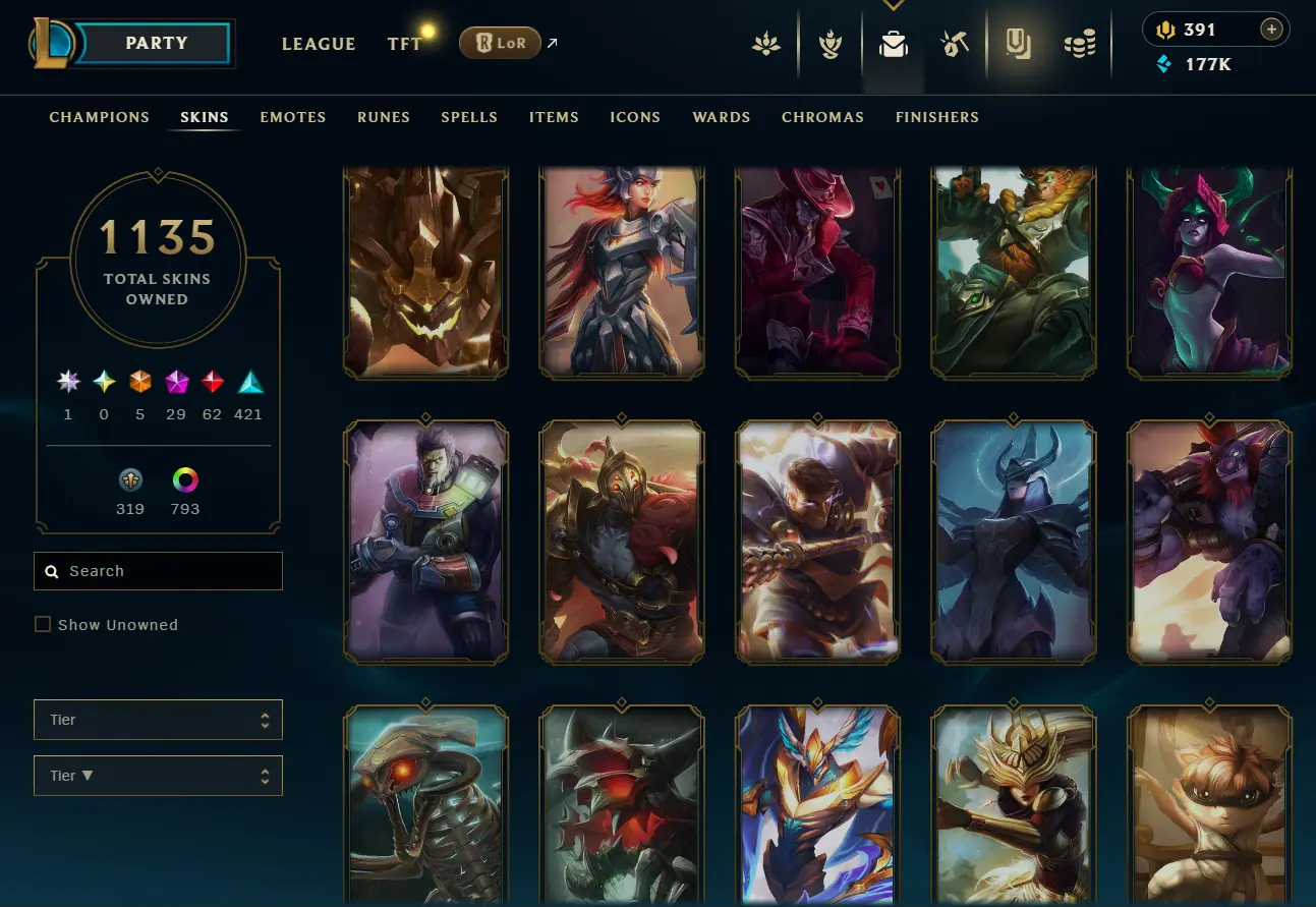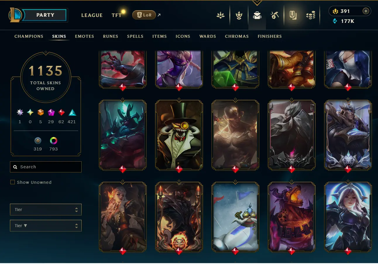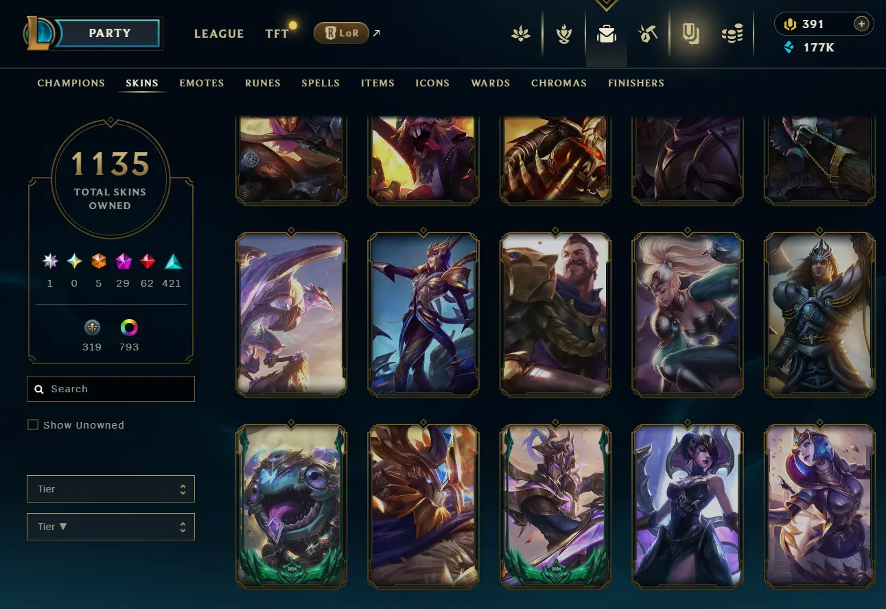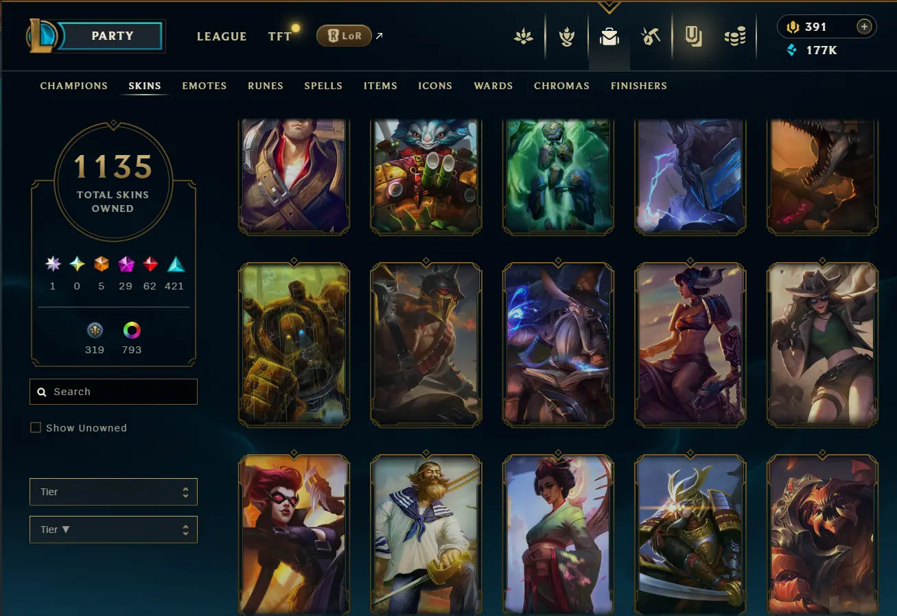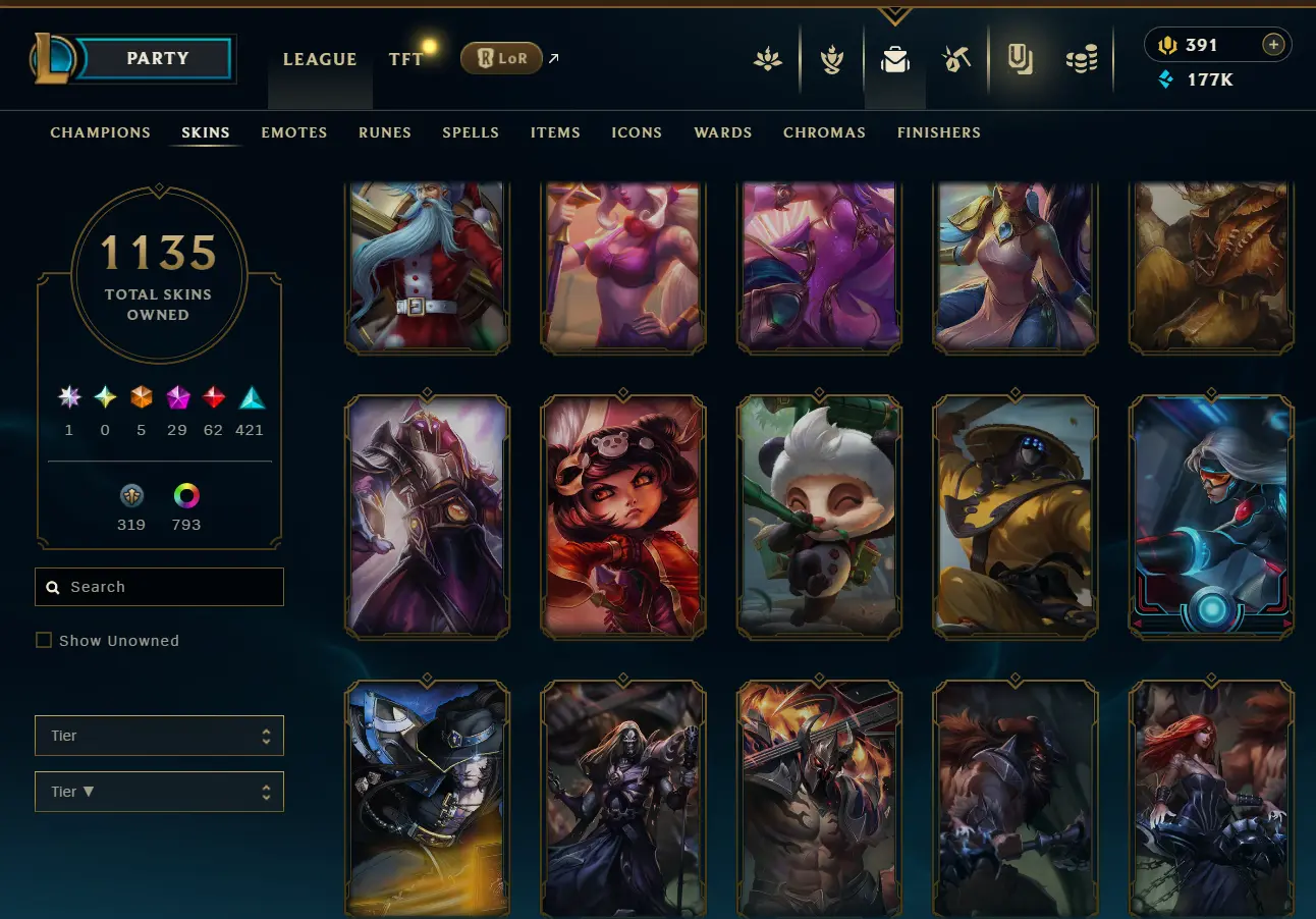 [EUW] 1135 skins ~ Quantum Galaxy Slayer Zed + Risen Legend Ahri + All Rare Skins Like: All Pax Skins + Black Alistar + Young Ryze etc + Full Rare Icons + Tft Loot