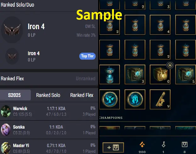 EUW [2025 S3] Iron IV 0LP 0W 5L Hand Deranked Low MMR HandLeveled 350+ RP Prime Loot 30k+ BE Smurf Handmade (Iron 4) Ranked Ready