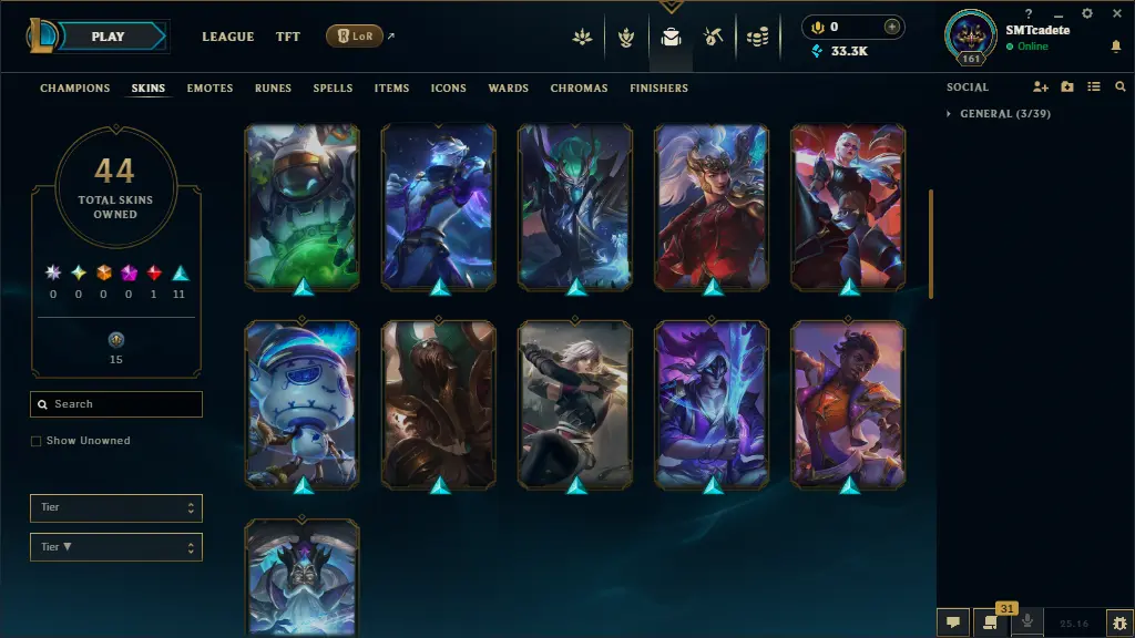 【LAS】– Level 161 🎮 Silver 4 – 12 LP 🏅 (B2 Flex – B1 Last Season) – 44 Skins 🎨 [33,355 BE 💎 | 0 RP 🔥 | 90 MESS ✨] – Honor 4 🌟 – 99 Champs ⚔️
