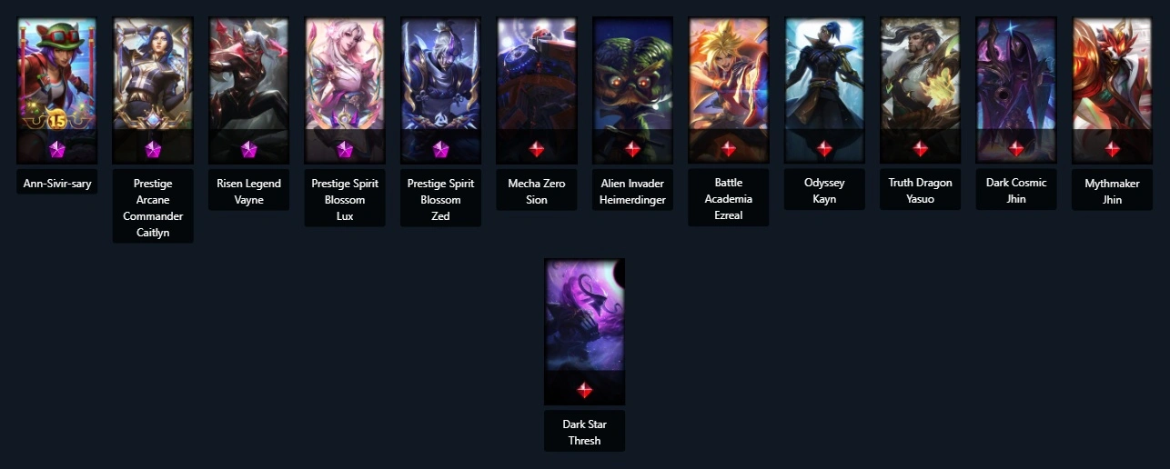 Silver 3┃138 skins┃171 Champs┃(5 Mythic) Risen Legend Vayne Prestige Spirit Blossom Lux Prestige Spirit Blossom Zed Prestige Arcane Commander Caitlyn Odyssey Kayn Truth Dragon Yasuo Dark Star Thresh