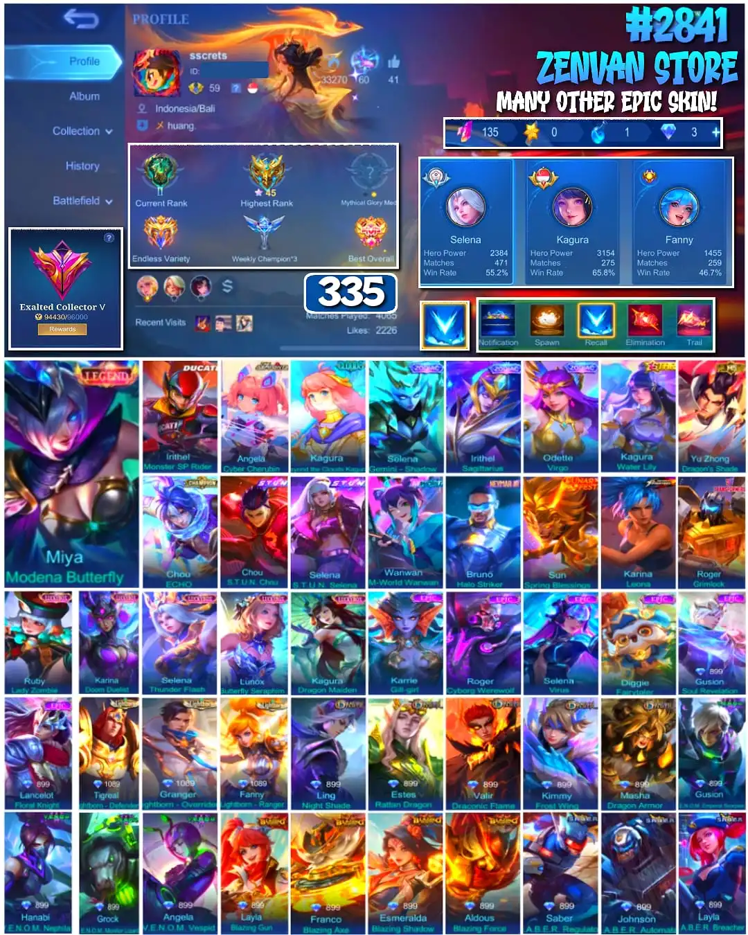 #2841 ๐ฅ 335 Skins ๐ฅ Legend Miya ๐ฅ Ducati Irithel ๐ฅ Aspirant Angela ๐ฅ Clouds Kagura ๐ฅ Stun Chou, Selena ๐ฅ M-World Wanwan ๐ฅ Transformers Roger ๐ฅ Many Limited ๐ฅ Many Epic ๐ฅ Safe Account โ