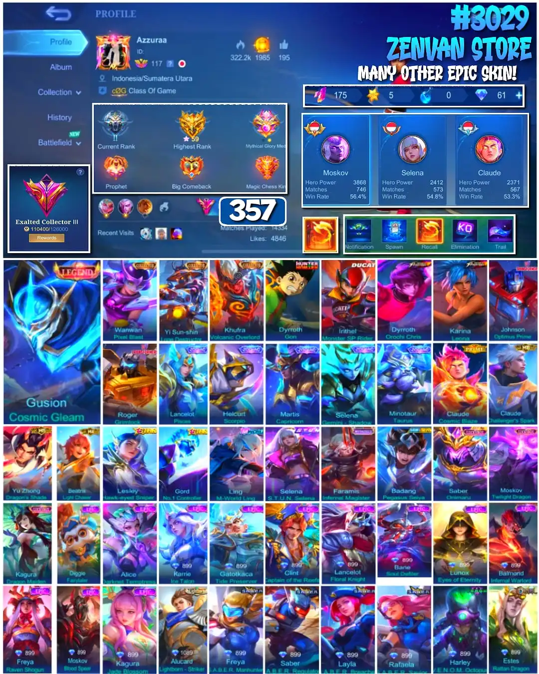 #3029 ๐ฅ 357 Skins ๐ฅ Legend Gusion ๐ฅ Collector Wanwan, Yin Sun Shin & Kufra ๐ฅ Hunter X Hunter Gon ๐ฅ Ducati Irithel ๐ฅ Transformers Johnson & Roger ๐ฅ Prime ๐ฅ Many Limited ๐ฅ Many Zodiak ๐ฅ Many Epic ๐ฅ Safe Account โ