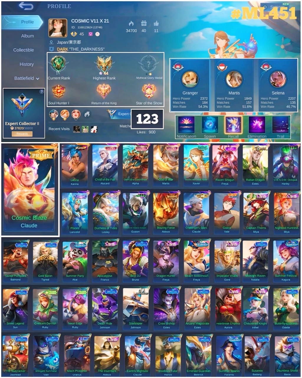 ML 451⚡Skins 123⚡️Hero 75⚡️Prime Claude⚡️Kof Karina⚡️Luckybox Alucard Alpha Martis⚡️Clouds Xavier⚡️Dragon Estes⚡️Venom Harley Gusion⚡️Zodiac Lancelot⚡️Covenant Lesley⚡️Blazing Aldous⚡️M6 Claude⚡️Naruto Vale⚡️