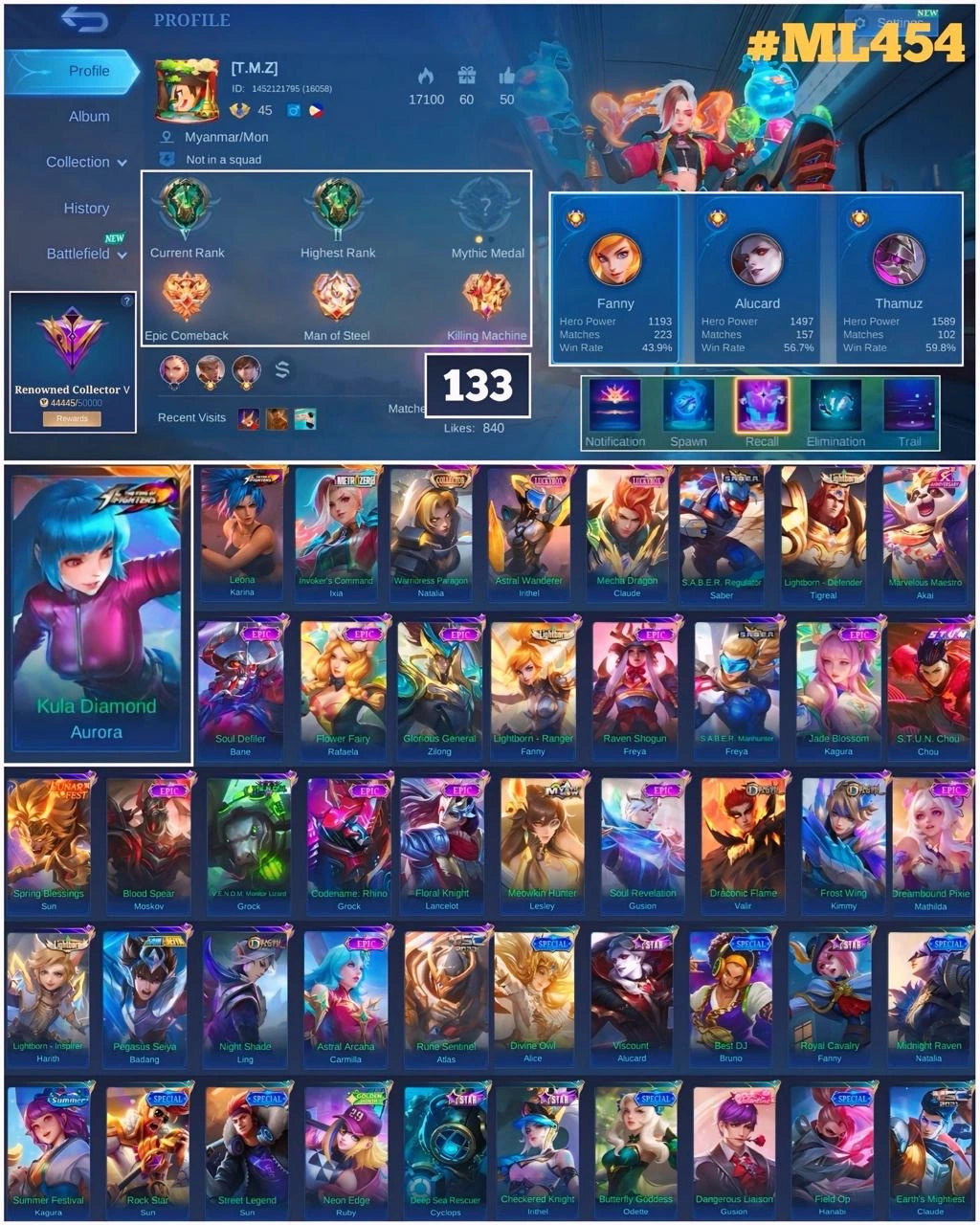 ML 454⚡Skins 133⚡️Hero 79⚡️Kof Aurora Karina⚡️Metrozero Ixia⚡️Collector Natalia⚡️ Luckybox Irithel Claude⚡️Saber⚡️Lightborn Tigreal Fanny⚡️11 Epic⚡️Stun Chou⚡️Lunarfest Sun⚡️Venom Grock⚡️Mystic Lesley⚡️Dragon Valir Kimmy⚡️Seint Badang⚡️