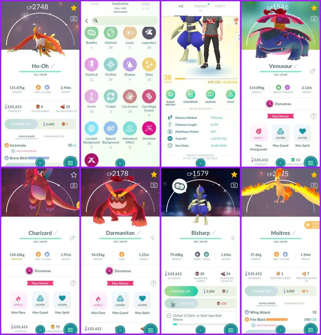 LEVEL 38(INSTINCT)🔥396/400 Pokemon🔥38 Legendary🔥18 Dynamax🔥10 Shiny🔥Moltres🔥D-Max Shiny🔥D-Max Venusaur🔥Name Change Available🔥Instant Delivery
