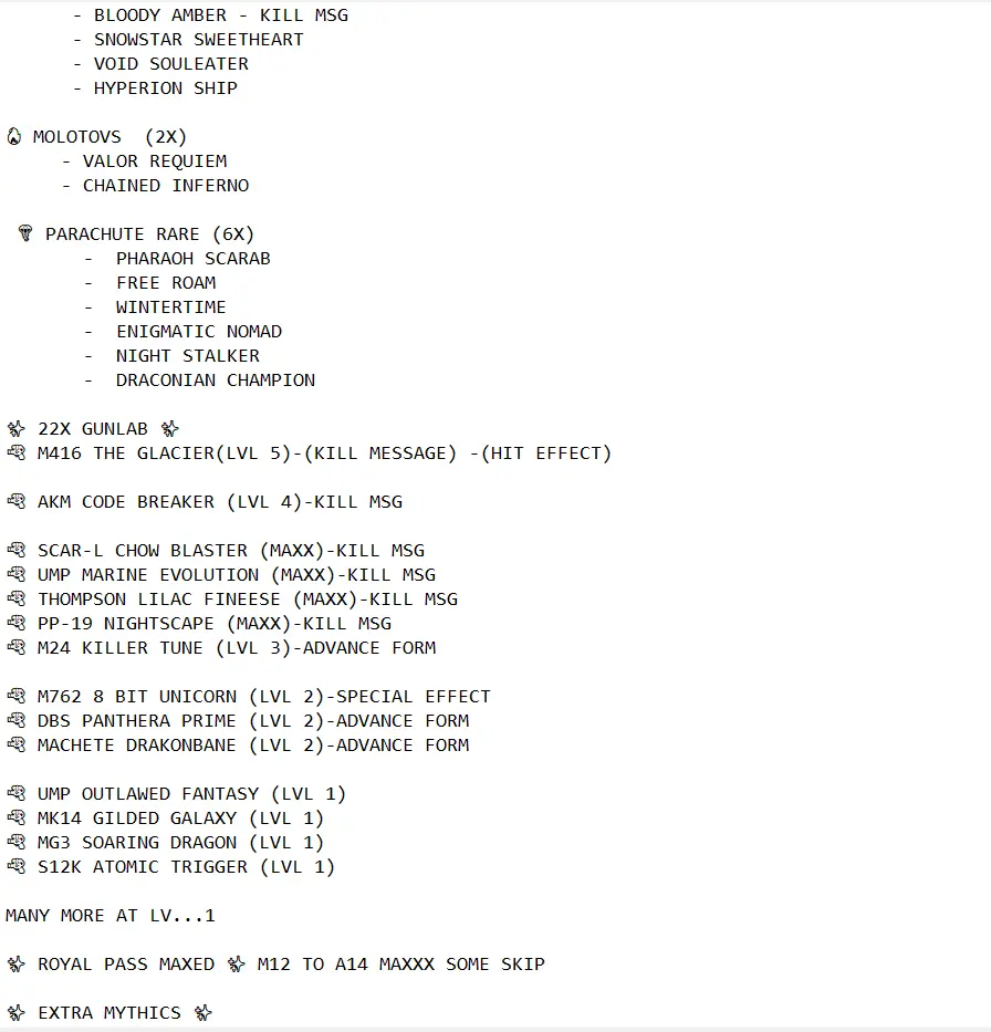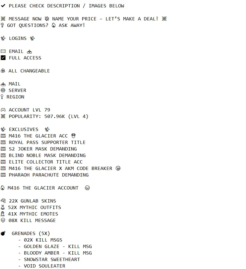 🏆 ACC LVL 79 🎯 M416 GLACIER + AKM CODE BREAKER 💬 KILL MSG 💥 22x GUNLAB 💀 8x KILL MESSAGES 🃏 S2 JOKER MASK 👑 ROYAL PASS SUPPORTER TITLE 💣 GERNADE MOLEE 🔥 RARE EMOTES 🎭 MYTHICS 💎 HELMETS 🪖 BACKPACKS 🎒 PARACHUTES 🪂 GLIDERS ✨ SECURE 🔐