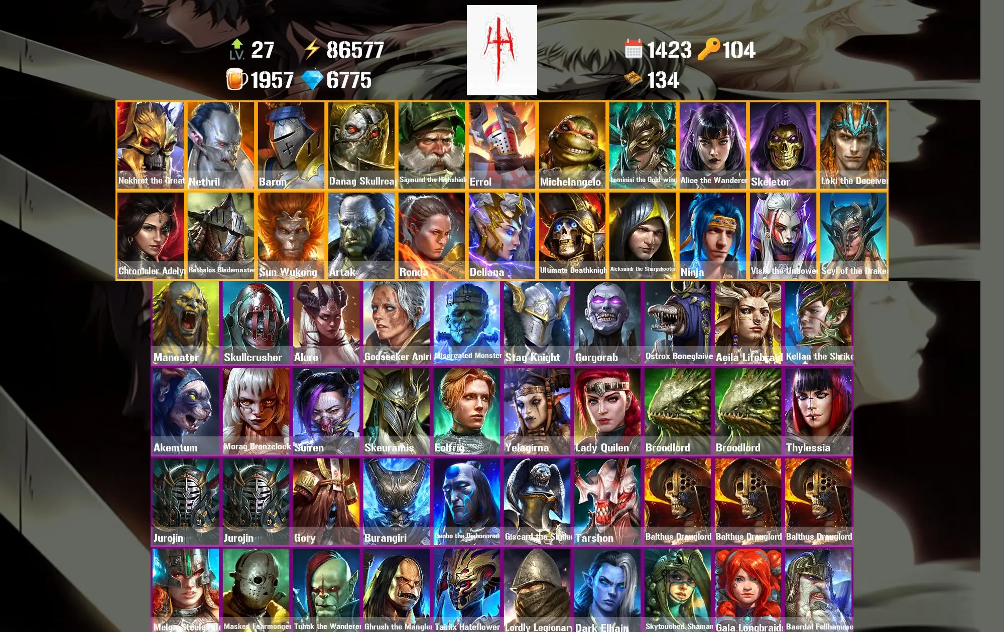 1423 Days 86.6k Energy [Mythical Starter] Ash'nar Dragonsoul βΈ± Nekhret the Great βΈ± Nethril βΈ± Baron βΈ± Danag Skullreap βΈ± Sigmund the Highshield βΈ± Maneater βΈ± Skullcrusher βΈ± 55.4m Silver βΈ± 6.8k Gems