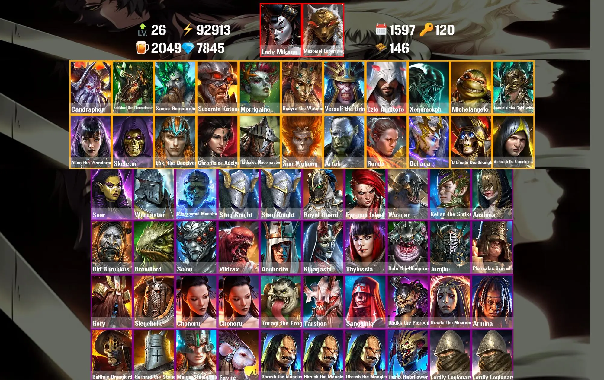 1597 Days 92.9k Energy [Mythical Starter] Lady Mikage ⸱ Mezomel Luperfang ⸱ Candraphon ⸱ Kro'khad the Throatripper ⸱ Samar Gemcursed ⸱ Suzerain Katonn ⸱ Morrigaine ⸱ Seer ⸱ Warcaster ⸱ 61.5m Silver ⸱ 7.8k Gems