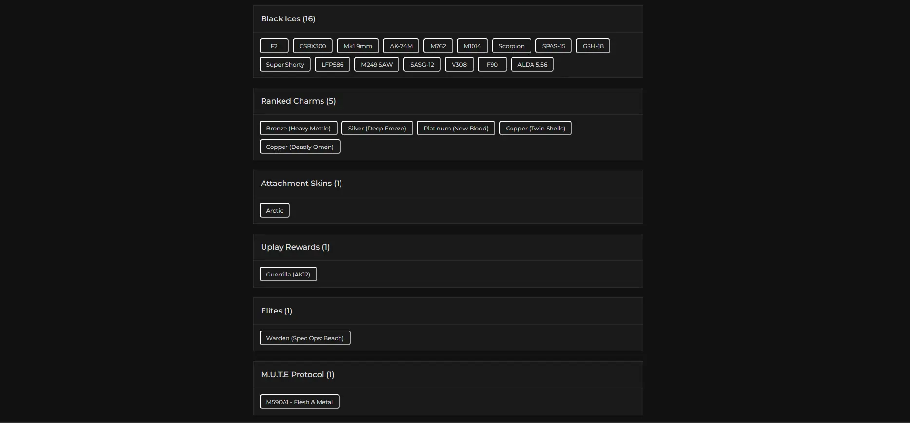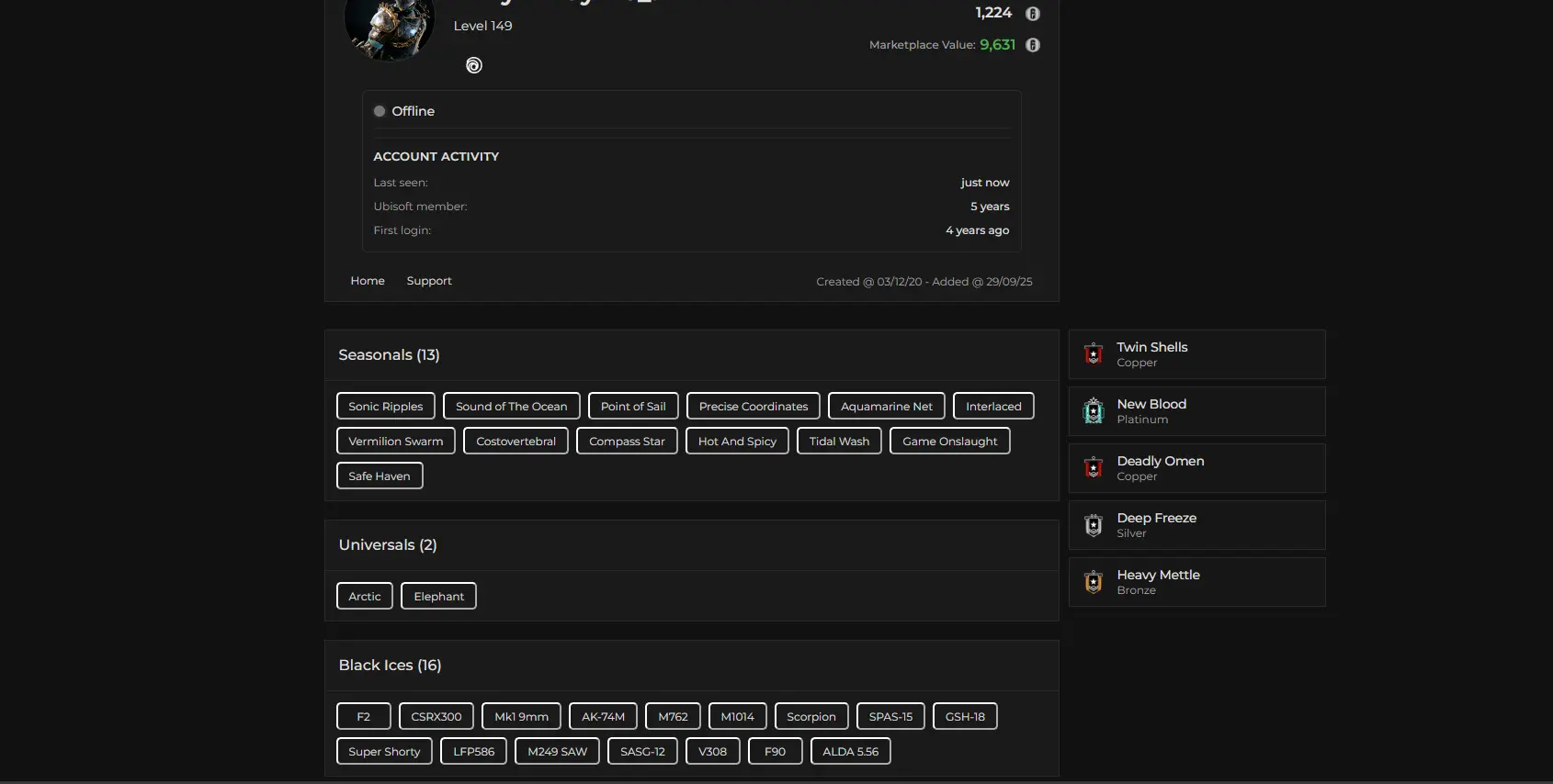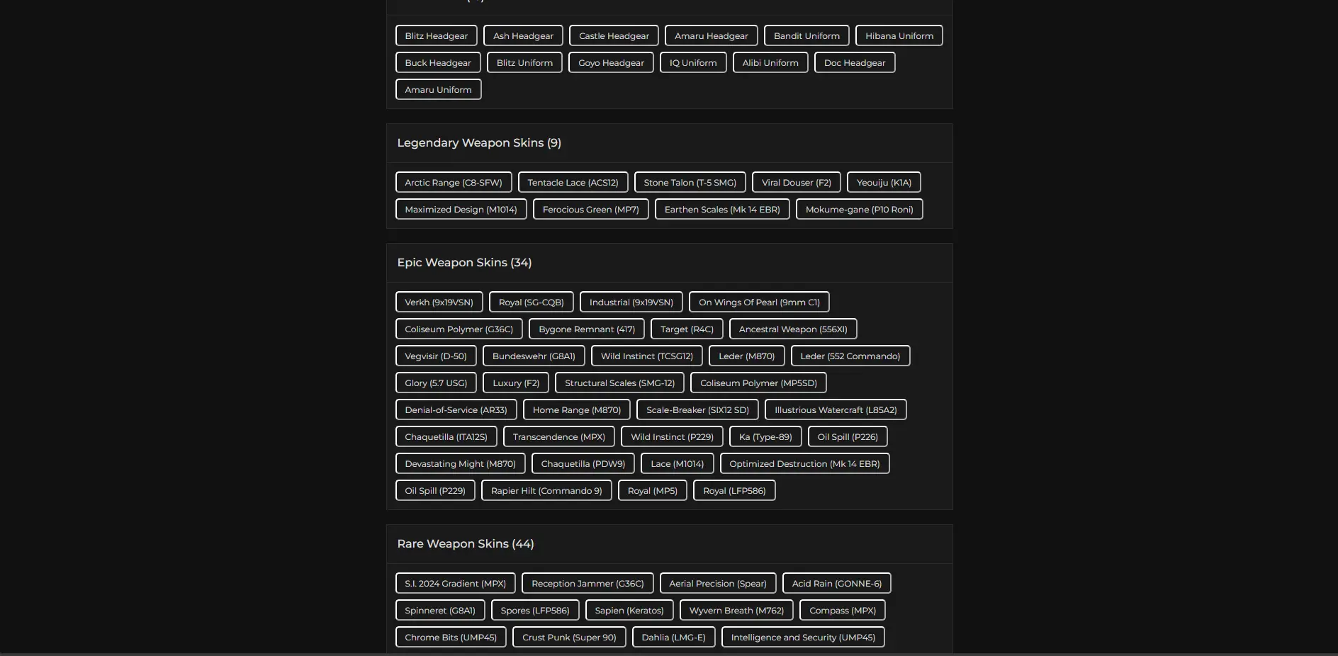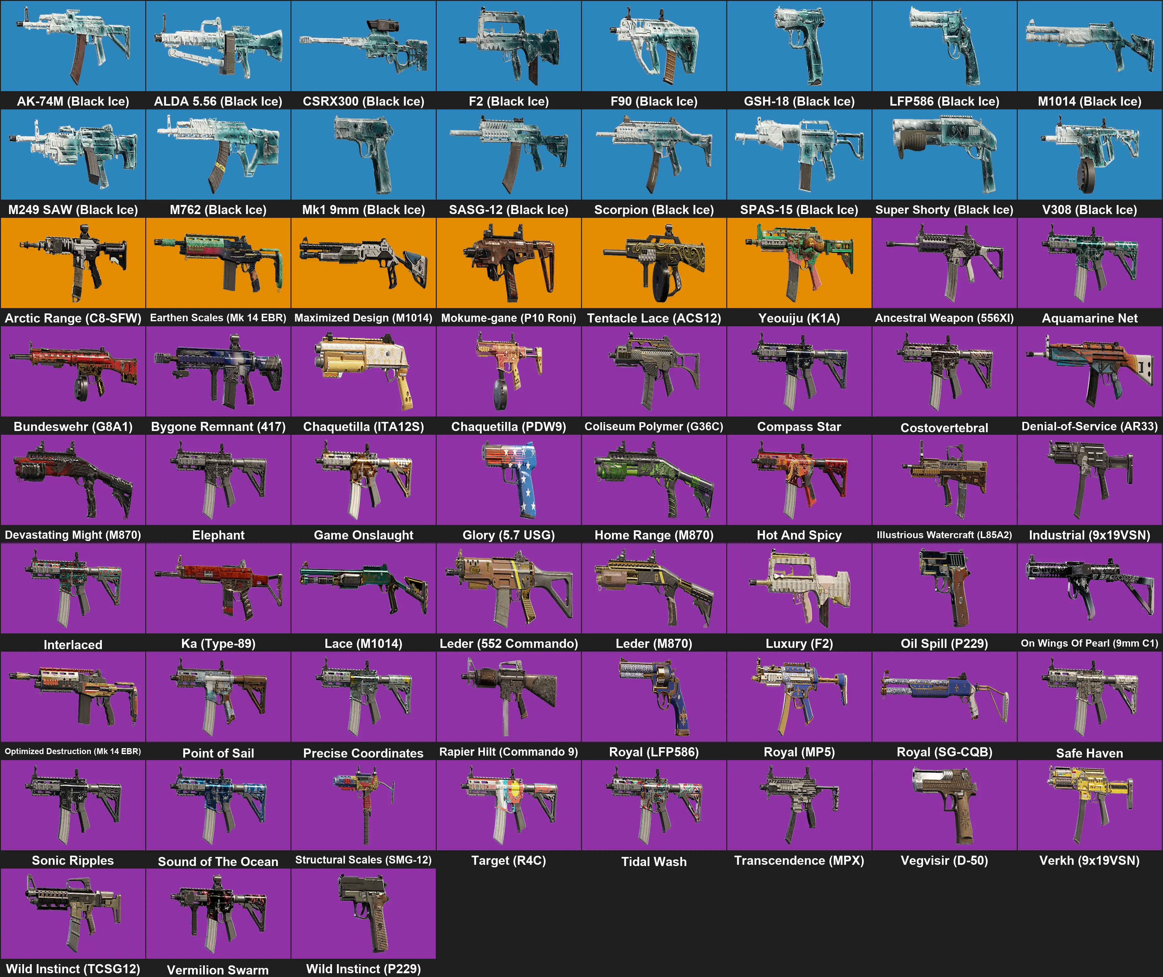 【PC/PSN/XBOX】 🎨 145 Skins 🧊 16 Black Ice 🌸 13 Seasonals 🌍 2 Universals ⭐ 1 Elite 📈 149 LVL