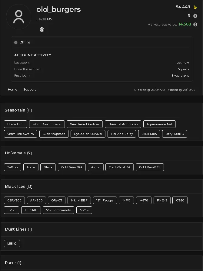 ⭐[PC/XBOX/PSN PLAYABLE]⭐Level 195✅3 Pro League Old🎨7 Universal Skin🌸11 Seasonals Skin❄️13 Black Ice👑74 Operators🔥201 Weapon Skin⚜️3 Elite💫54K Renown