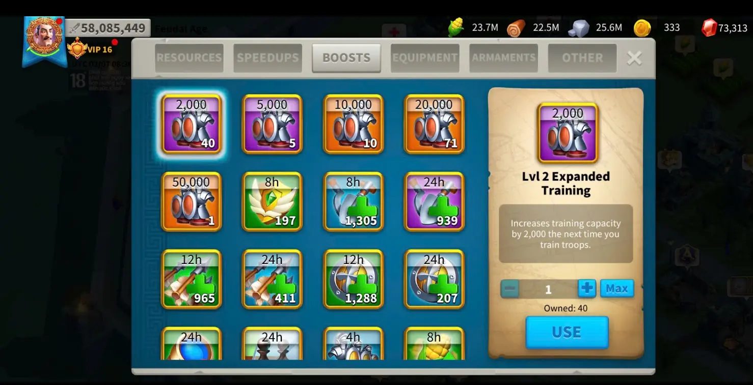 57M ⸱ Vip 16 ⸱ Speed 2190 day ⸱ Max 10 Commanders + 2929 Gold Heads ⸱ 2 skin houses (Twilight Falls , Topkapi) + 35 PassPort (ready to move) + 8,5M Silver coin + 4 Farm (15M + 10M + 10M + 7,9M Pow)