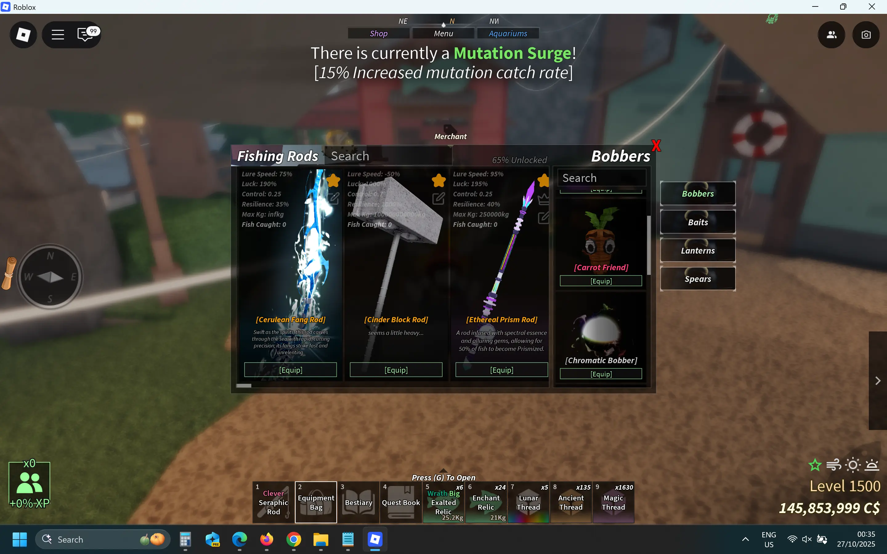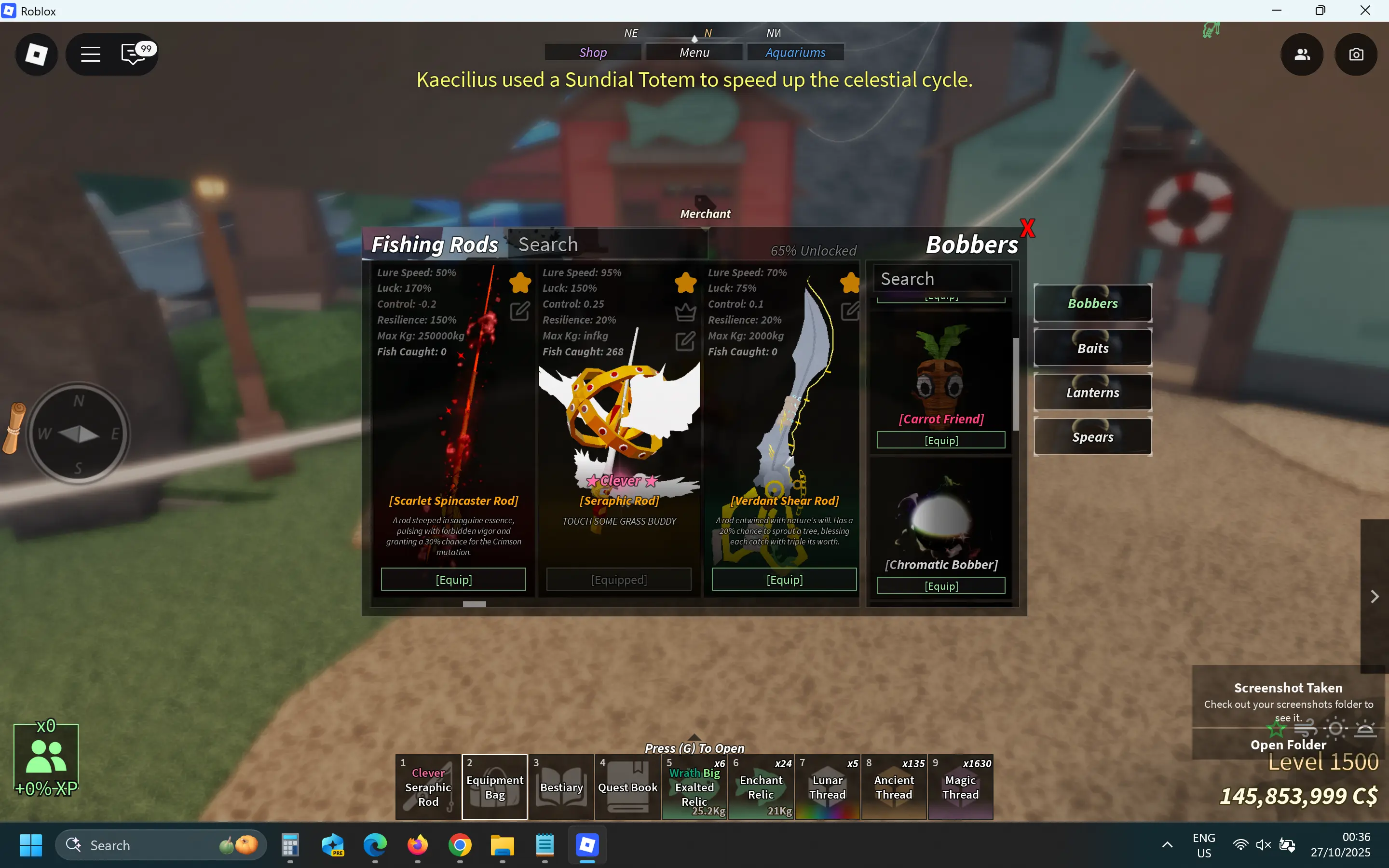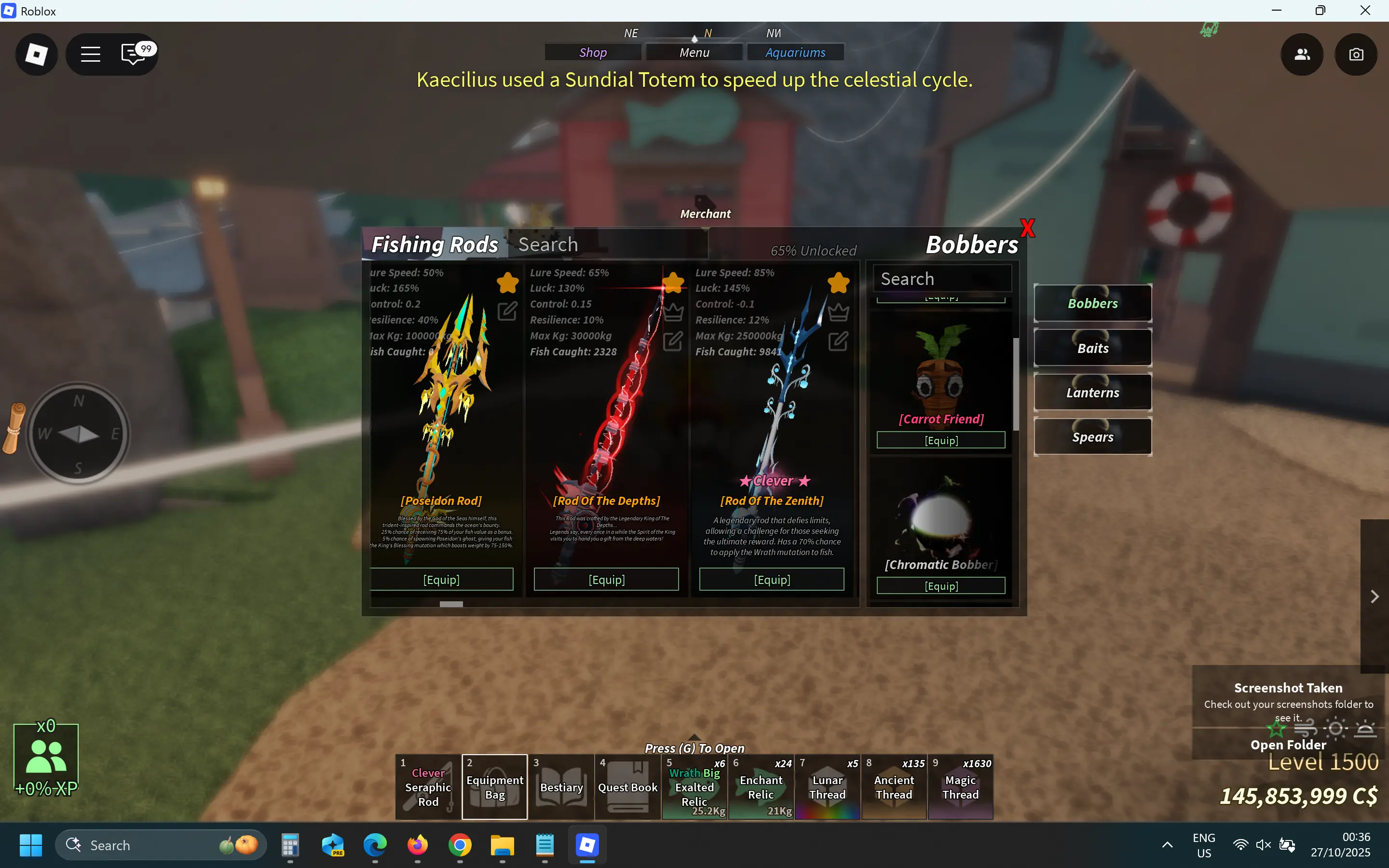 [Instant] [Fisch] Level 1500 | 145M C$ | Rods (65%): Luminescent Oath, Cerulean Fang, Ethereal Prism, Frostbane, Great Rod of Oscar, Leviathan, Original No-Life, Zenith, Wicked Fang, Cinder Block, Scarlet Spincaster, Verdant Shear | Exalted/Enchant Relic