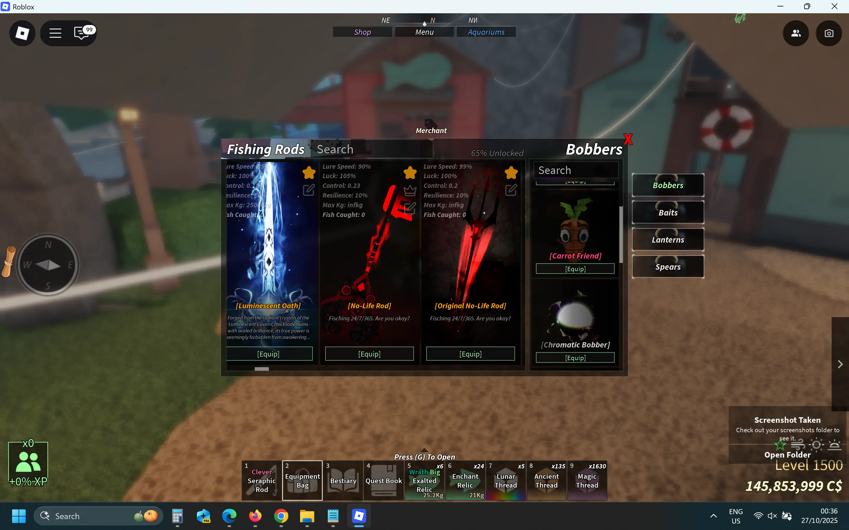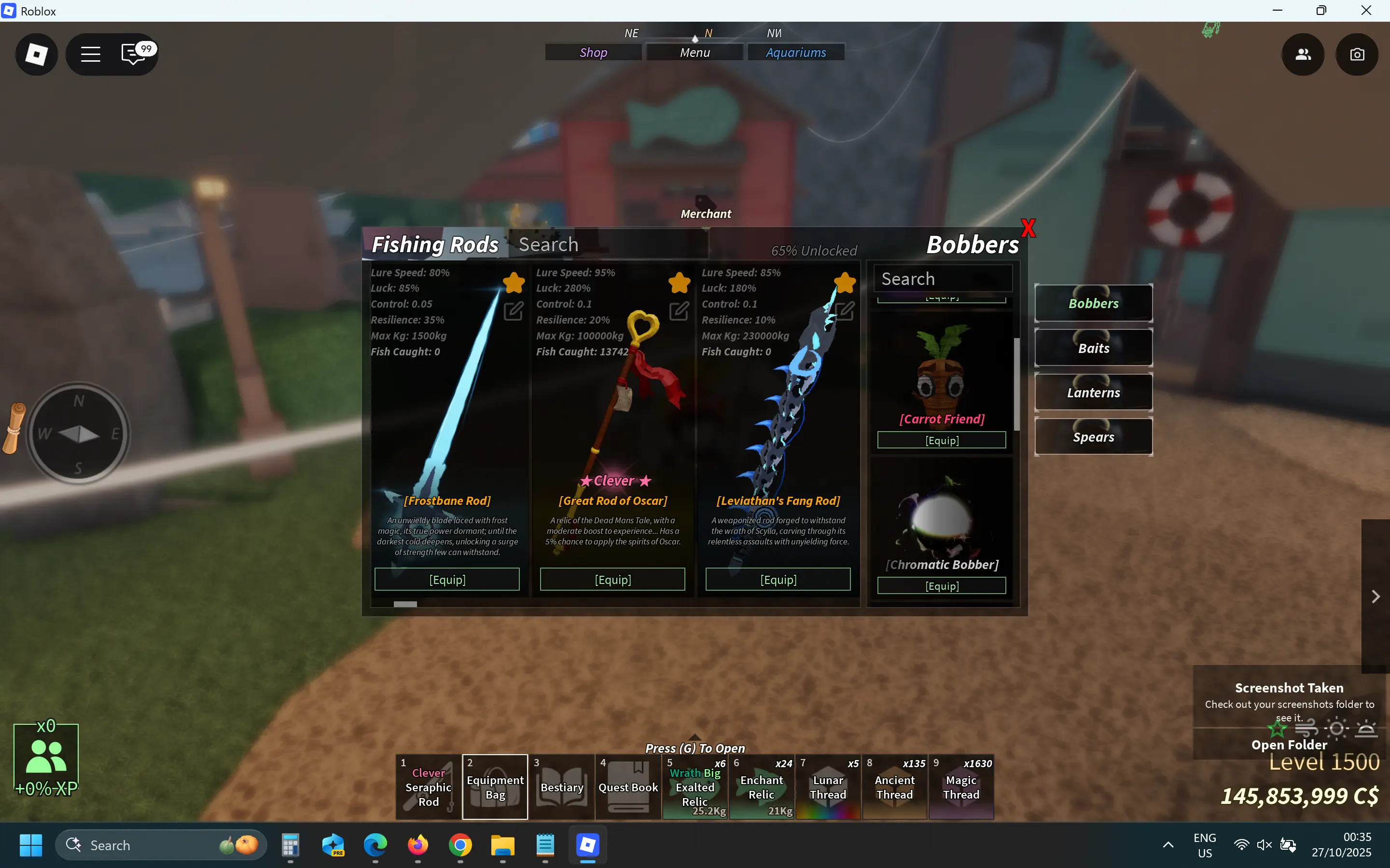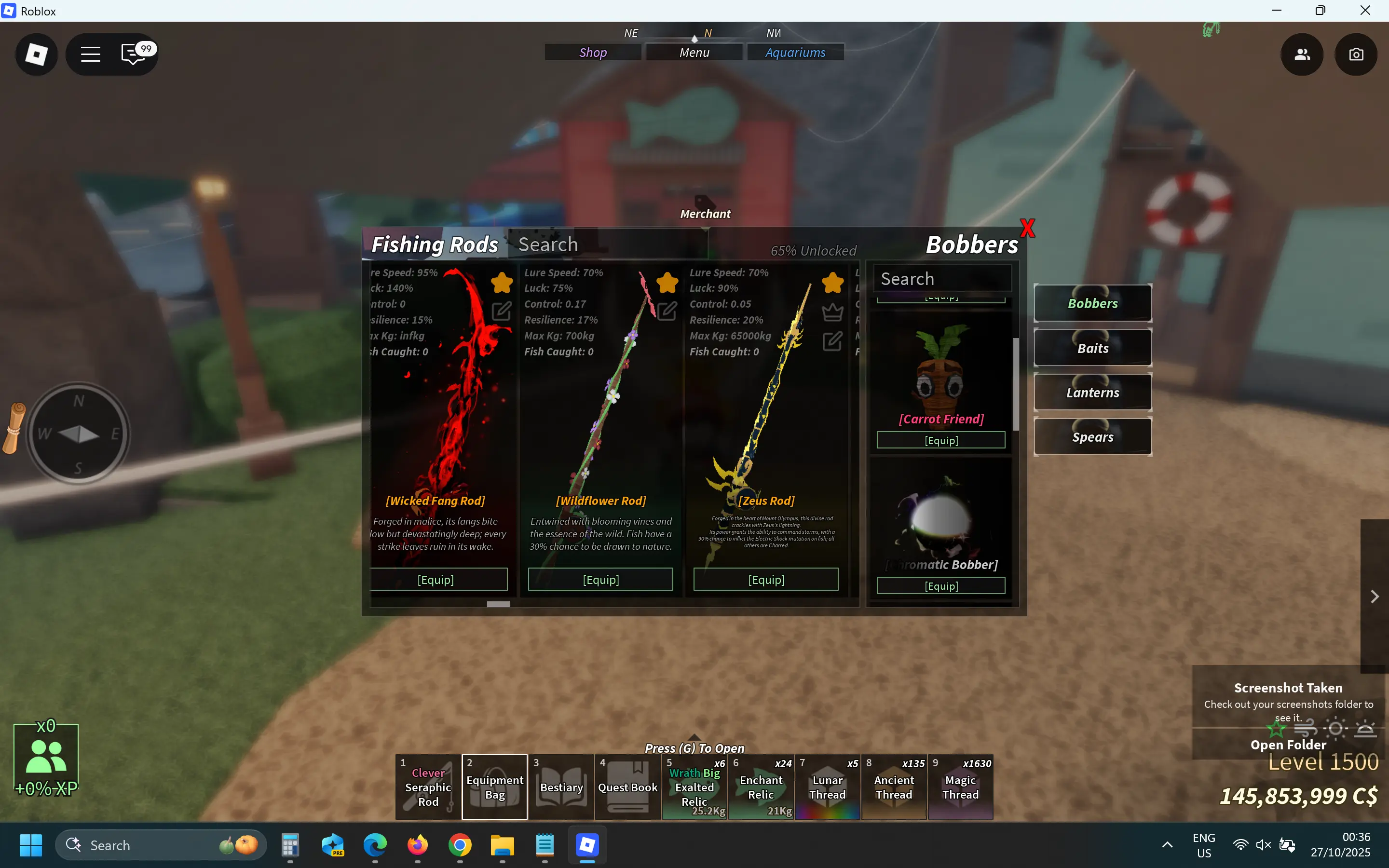 [Instant] [Fisch] Level 1500 | 145M C$ | Rods (65%): Luminescent Oath, Cerulean Fang, Ethereal Prism, Frostbane, Great Rod of Oscar, Leviathan, Original No-Life, Zenith, Wicked Fang, Cinder Block, Scarlet Spincaster, Verdant Shear | Exalted/Enchant Relic