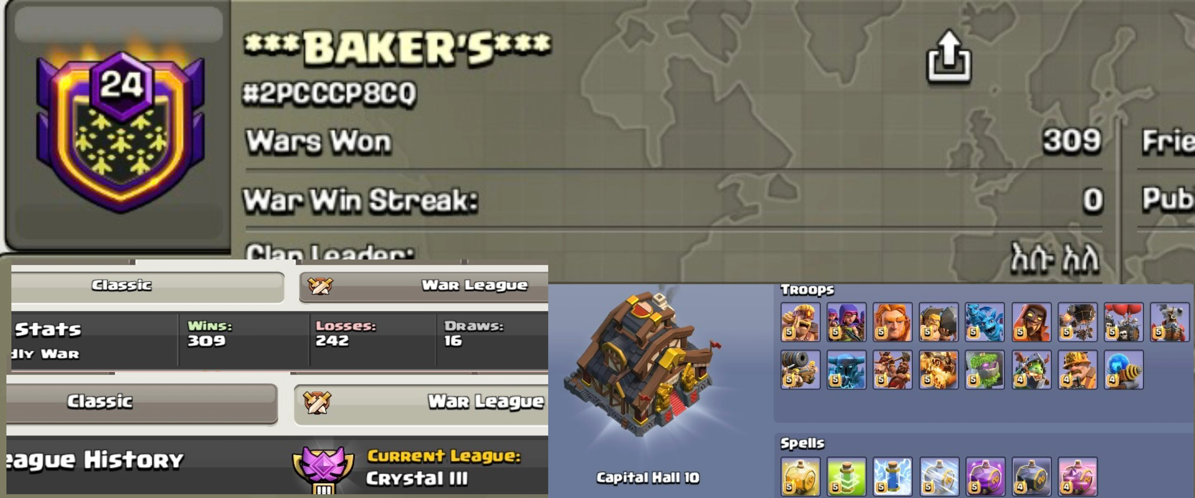 24 Level Clan🔥Name: ***BAKER’S***🔥Kristal III Ligue🔥Warlog (309-242)🔥 Capital Hall 10 Maxs🔥Velue For money