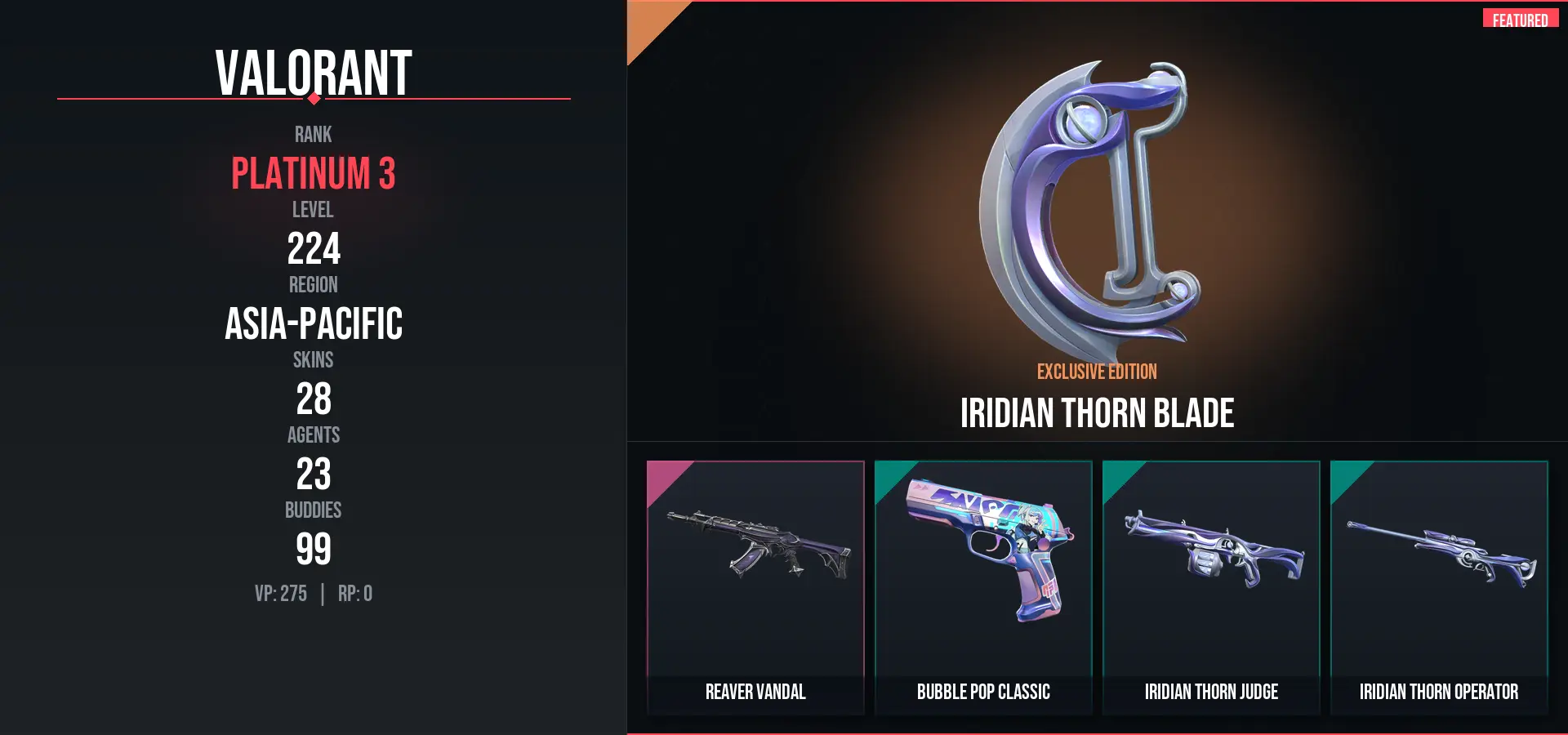 28 Skins / 1775 VP SPENT / Iridian Thorn Blade / Reaver Vandal