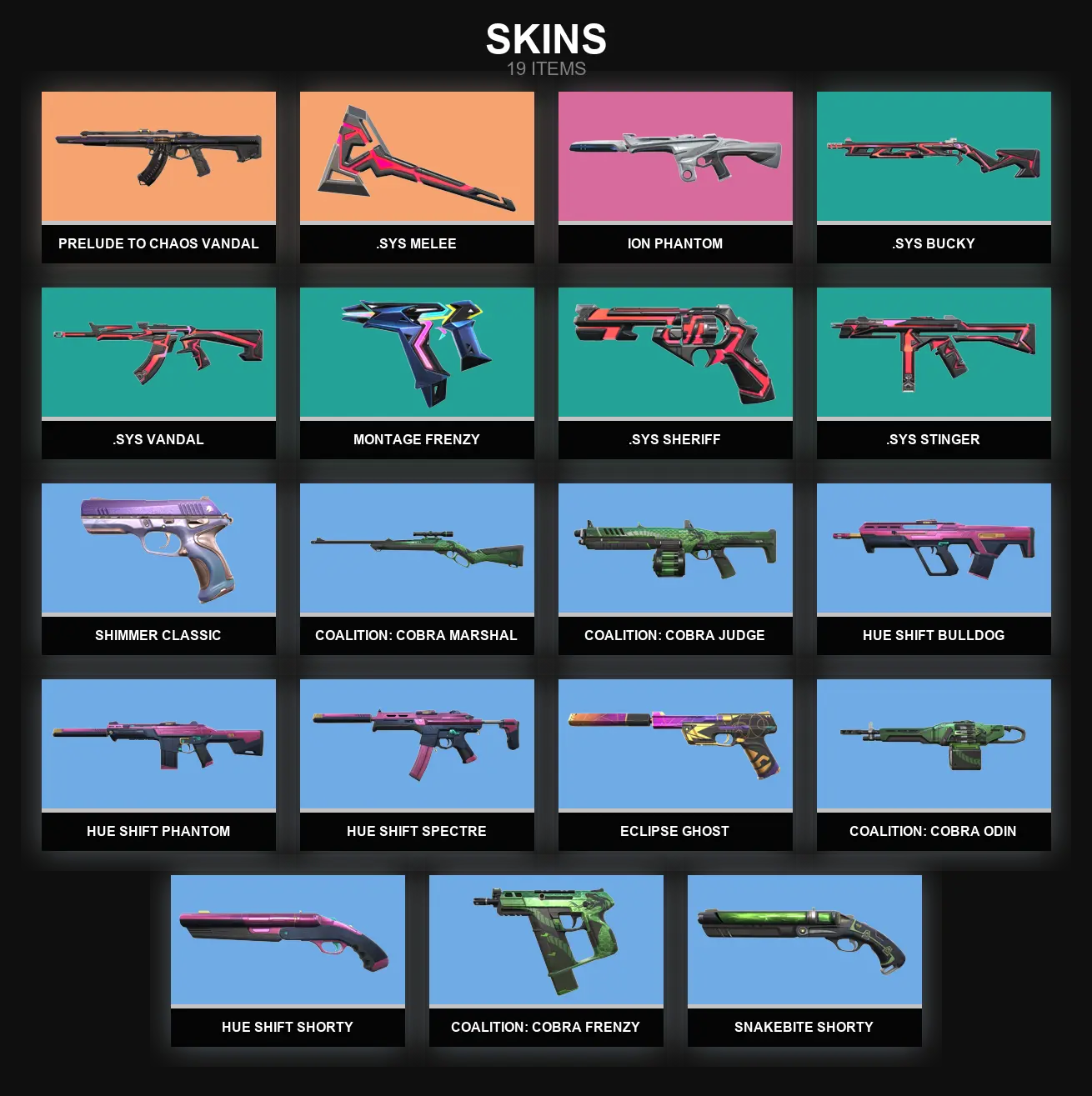 AP | 19 skins š Prelude to Chaos Vandal š .SYS Melee š Ion Phantom š .SYS Bucky š .SYS Vandal š Montage Frenzy š .SYS Sheriff š .SYS Stinger š Shimmer Classic š Coalition: Cobra Marshal š Coalition: Cobra Judge š Hue Shift Bulldog š J8025