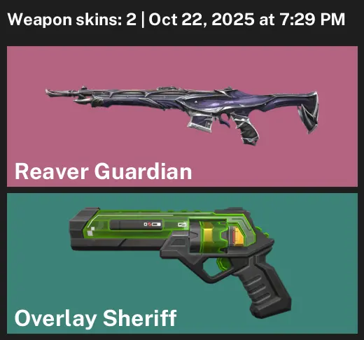 💥 AP 🐤 Bronze 2 🍺 2 Skins 🏟 214 VP 🐡 16 Agents 🦋 Value: 1775 VP 🫀 Reaver Guardian 🎳 Overlay Sheriff