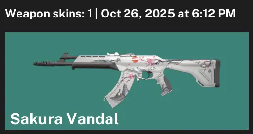 🔐 AP 👊 Unranked 🥇 1 Skins 🤝 75 VP ✉️ 6 Agents 🎣 Value: 1275 VP 🗑 Sakura Vandal
