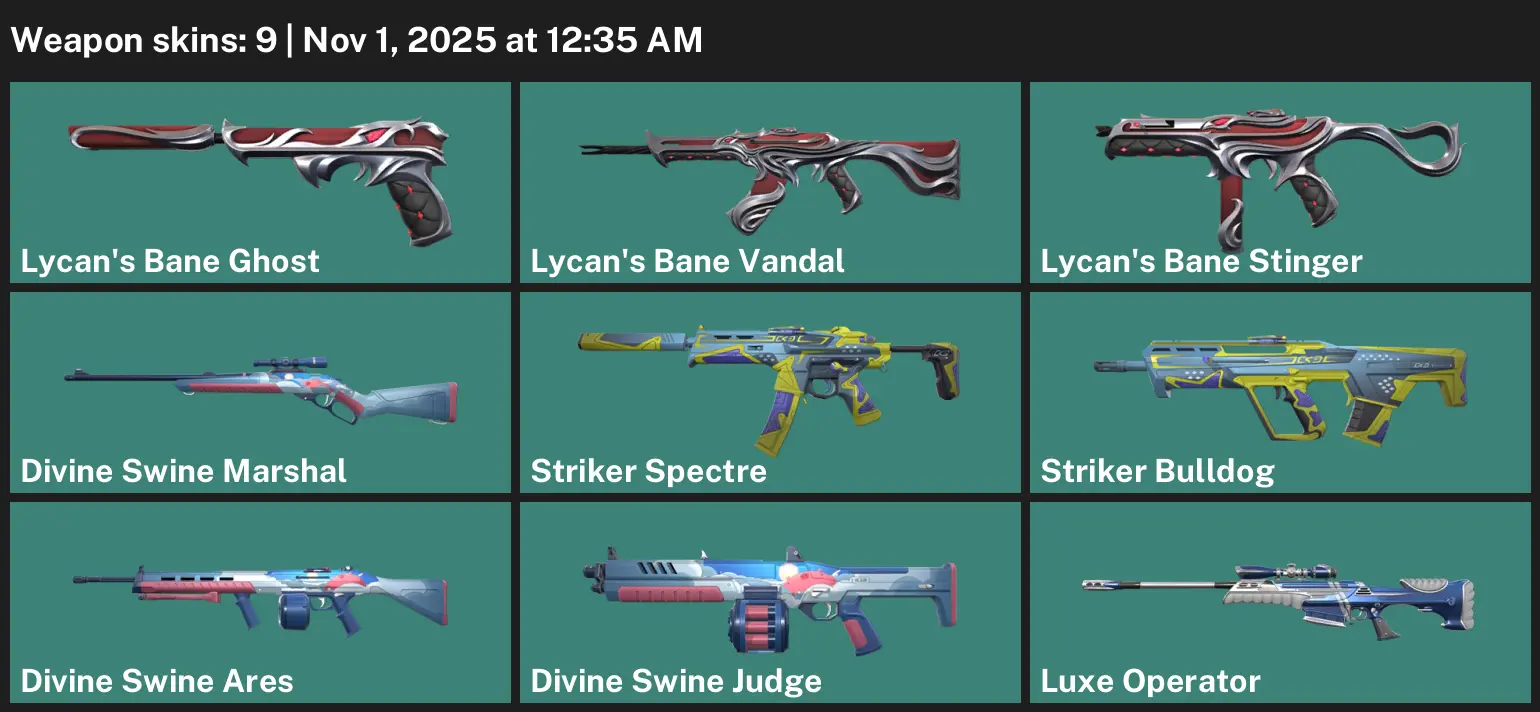 🚄 AP 🚂 Unranked 🥰 9 Skins ✍️ 100 VP 📀 3 Agents 👞 Value: 875 VP 🎠 Lycan's Bane Ghost 📬 Lycan's Bane Vandal 🐠 Lycan's Bane Stinger 😛 Divine Swine Marshal 🏏 Striker Spectre 🌮 Striker Bulldog