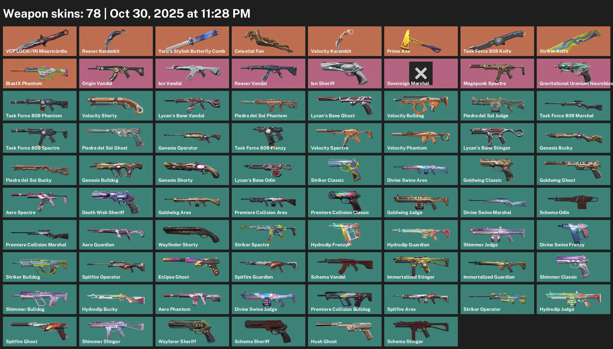 🐔 BR 🌉 Unranked 🦐 78 Skins 🤛 125 VP 🛋 16 Agents 🥯 Value: 35040 VP 🧀 VCT LOCK//IN Misericórdia 🏯 Reaver Karambit 🔥 Yoru's Stylish Butterfly Comb 🧿 Celestial Fan 🐼 Velocity Karambit 🥵 Prime Axe