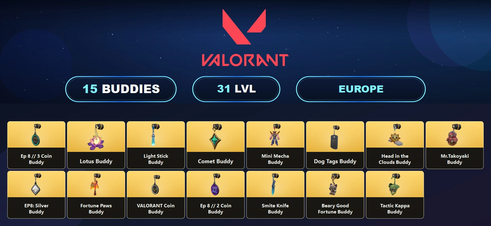 EU 🏁 11 Skins 🥪 31 Level 🐩 Comet Vandal 🔥 Comet Odin 💠 Tacti-Series Classic 🎪 Cloudweaver Shorty 🚍 Comet Spectre 🐔 Tacti-Series Guardian 🌙 Tacti-Series Frenzy 🪐 Unranked 👚 3 Agents