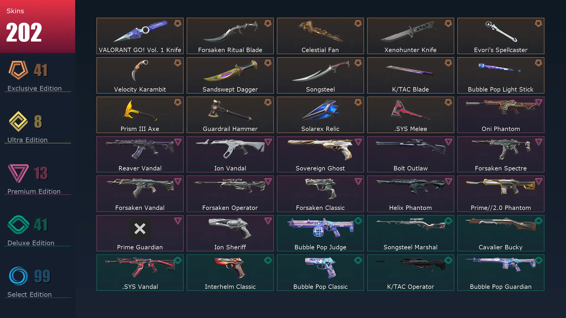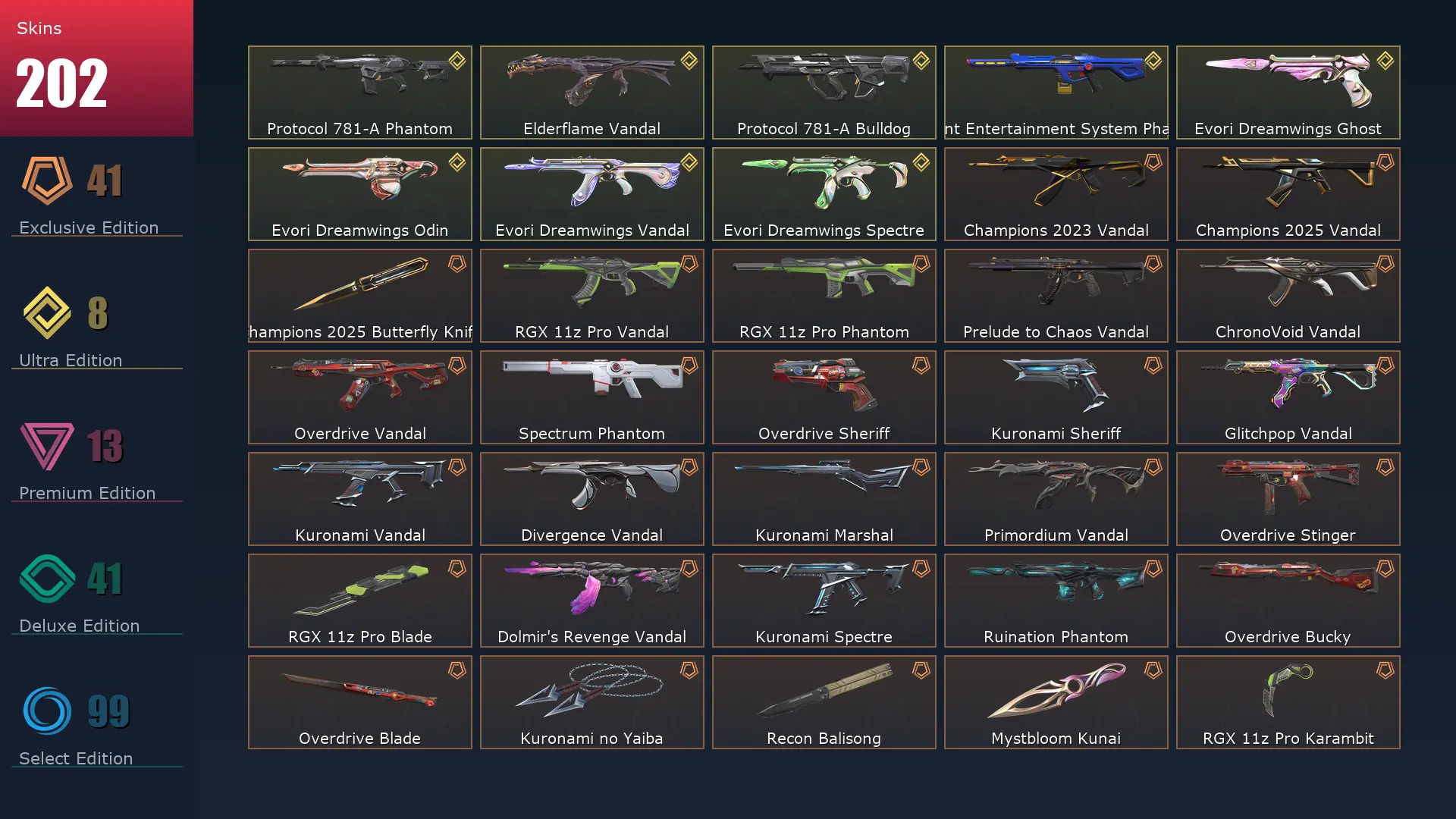 EU ð 202 Skins ðŦ Diamond 1 âïļâðĨ 29 Agents ðĪ 394 Level ð Champions 2023 Vandal ðĶ Champions 2025 Vandal â° Champions 2025 Butterfly Knife ð Velocity Karambit ðŠ Overdrive Sheriff ð Evori Dreamwings Odin ðĶ Recon Balisong ðđ Ion Vandal