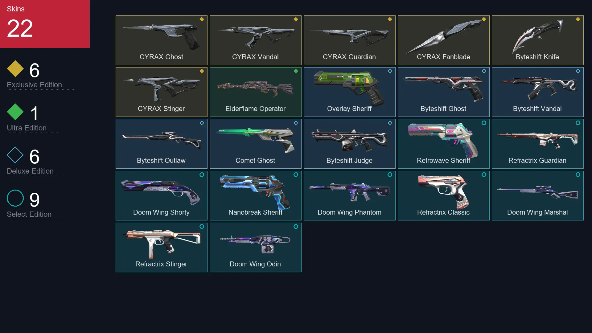 đ EU đ 22 Skins đ¯ 23 Agents đ¸ 96 Level đē đ CYRAX Ghost đ CYRAX Vandal âī¸ CYRAX Guardian đ° CYRAX Fanblade đ¸ Elderflame Operator +17 more