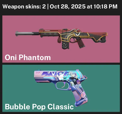 ๐ฆ EU ๐ Unranked ๐ณ 2 Skins ๐ฐ 175 VP ๐ฅ 13 Agents ๐ Value: 1775 VP ๐ฆโ๐ฅ Oni Phantom ๐งผ Bubble Pop Classic
