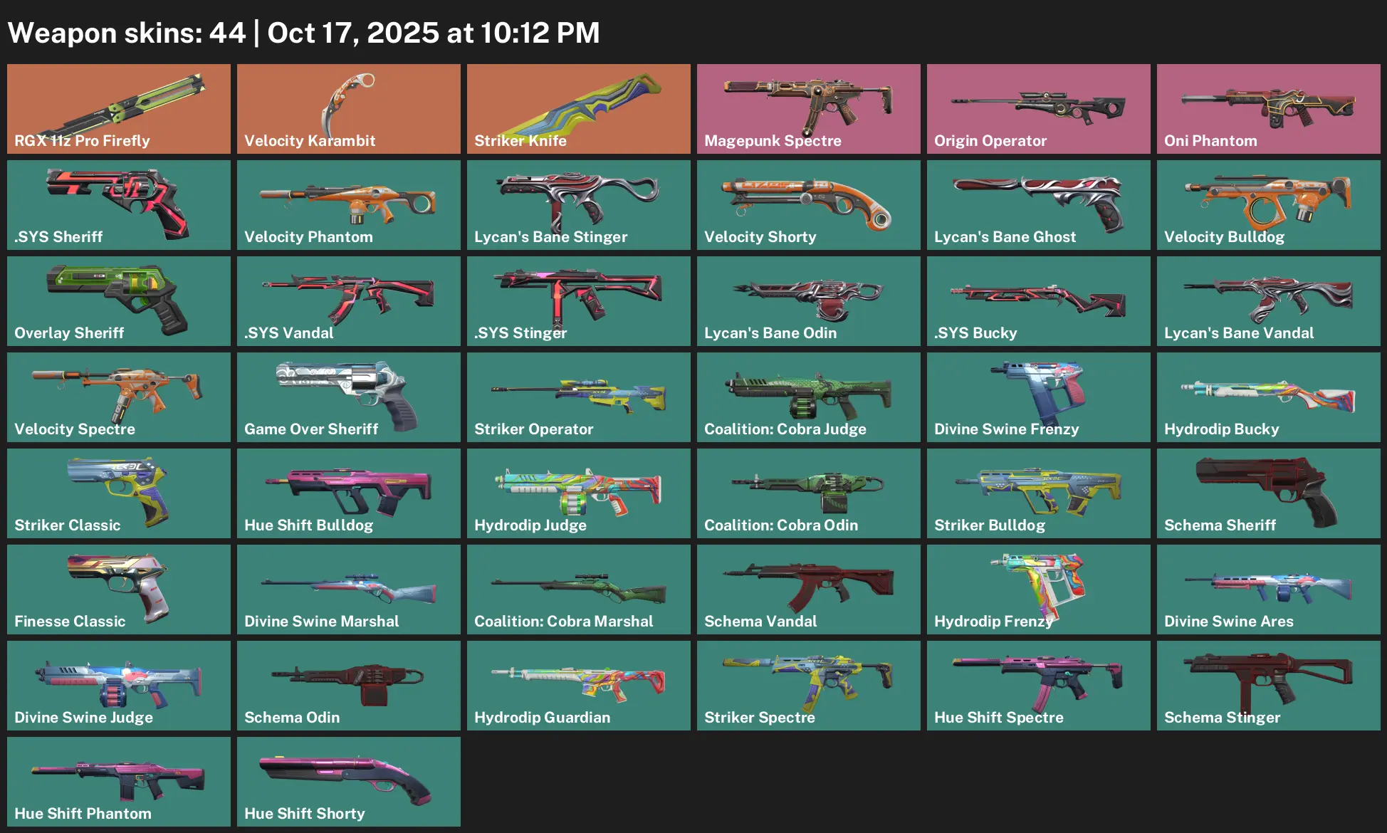 LA | 44 Skins | exp SILVER 2 | RGX 11z Pro Firefly | Oni Phantom | Origin Operator | Magepunk Spectre | .SYS Vandal | Schema Vandal | S4G