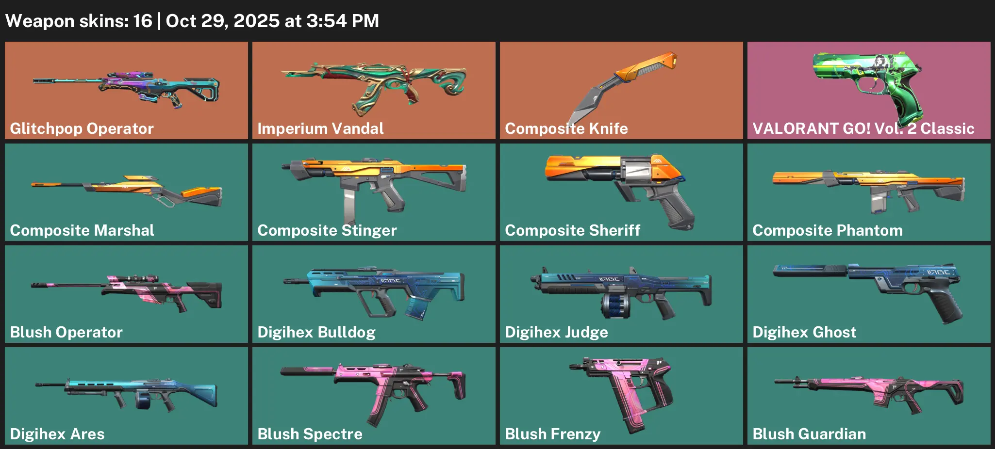 🍥 LA 🧧 Unranked 🏞 16 Skins ♟ 350 VP 💼 7 Agents ⛄️ Value: 6125 VP 🌕 Glitchpop Operator 🦦 Imperium Vandal 💨 Composite Knife 🌪 VALORANT GO! Vol. 2 Classic 👣 Composite Marshal 😙 Composite Stinger