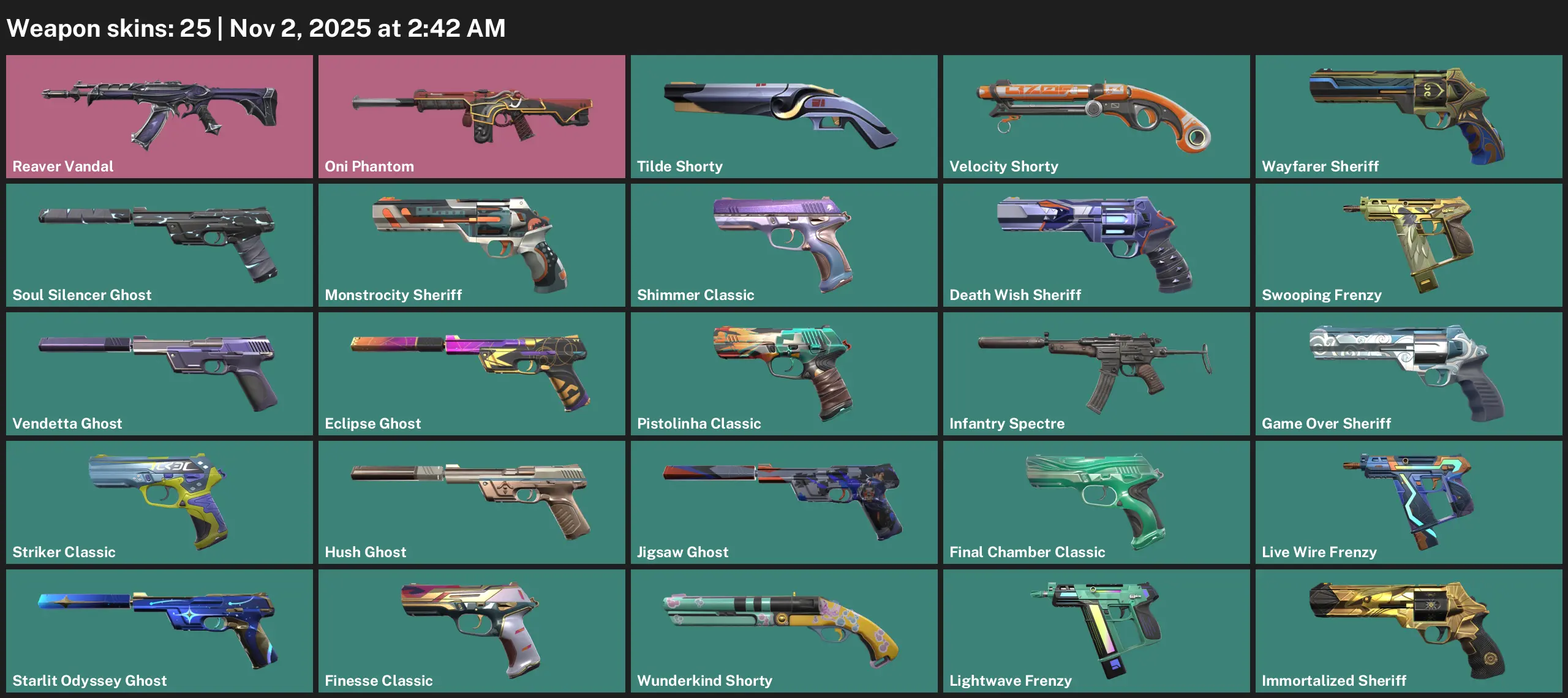 🎟 LA ⭐️ Unranked ⛲️ 25 Skins 🐞 10 VP 🙌 19 Agents 🫷 Value: 4425 VP 💡 Reaver Vandal 🎥 Oni Phantom 🥺 Tilde Shorty 🌷 Velocity Shorty ⛱ Wayfarer Sheriff 🥍 Soul Silencer Ghost