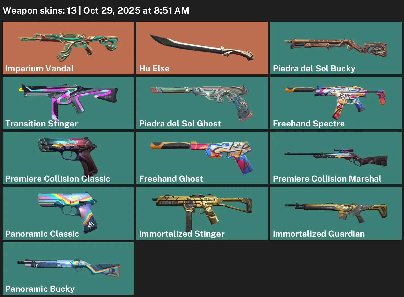 ð NA ð Unranked ðĐš 13 Skins ðŦ 200 VP ð 5 Agents ð· Value: 4725 VP ð Imperium Vandal ðĐŧ Hu Else ð Piedra del Sol Bucky ðđ Transition Stinger ð Piedra del Sol Ghost â Freehand Spectre