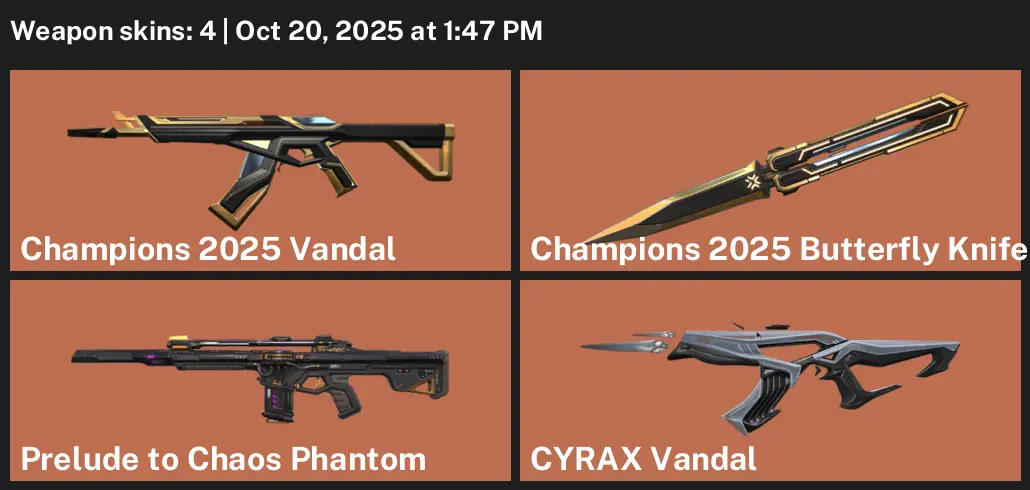 🦥 NA 🥁 Unranked 🦁 4 Skins 🛢 10 VP 🕊 2 Agents 😲 Value: 12375 VP 🍜 Champions 2025 Vandal 💋 Champions 2025 Butterfly Knife 📱 Prelude to Chaos Phantom 🤔 CYRAX Vandal