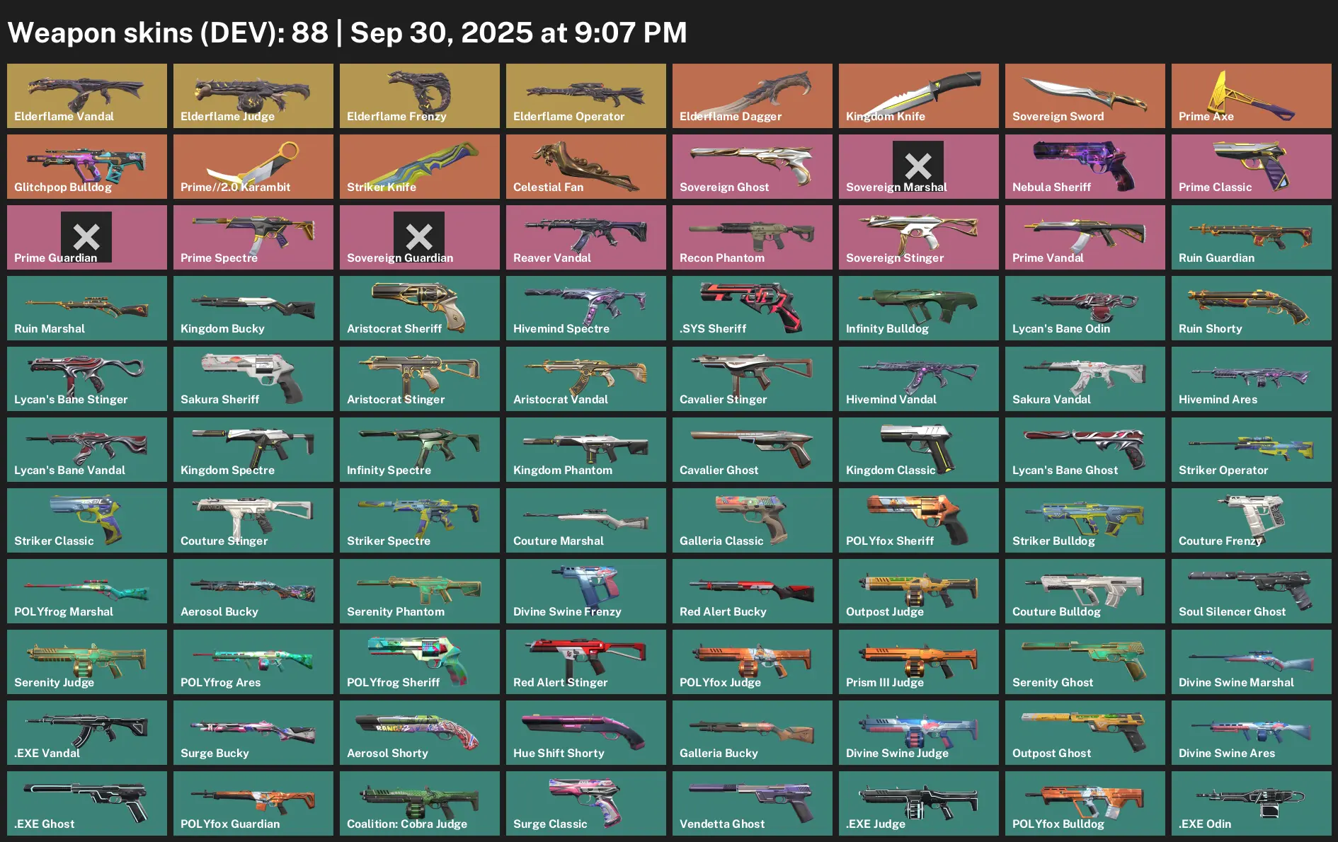 ๐ฎ NA ๐ Unranked ๐ 88 Skins ๐ 141 VP ๐ช 13 Agents โ๏ธ Value: 58875 VP ๐ณ Elderflame Vandal ๐ด Elderflame Judge ๐ฆฟ Elderflame Frenzy ๐ค Elderflame Operator ๐ซ Elderflame Dagger ๐ Kingdom Knife