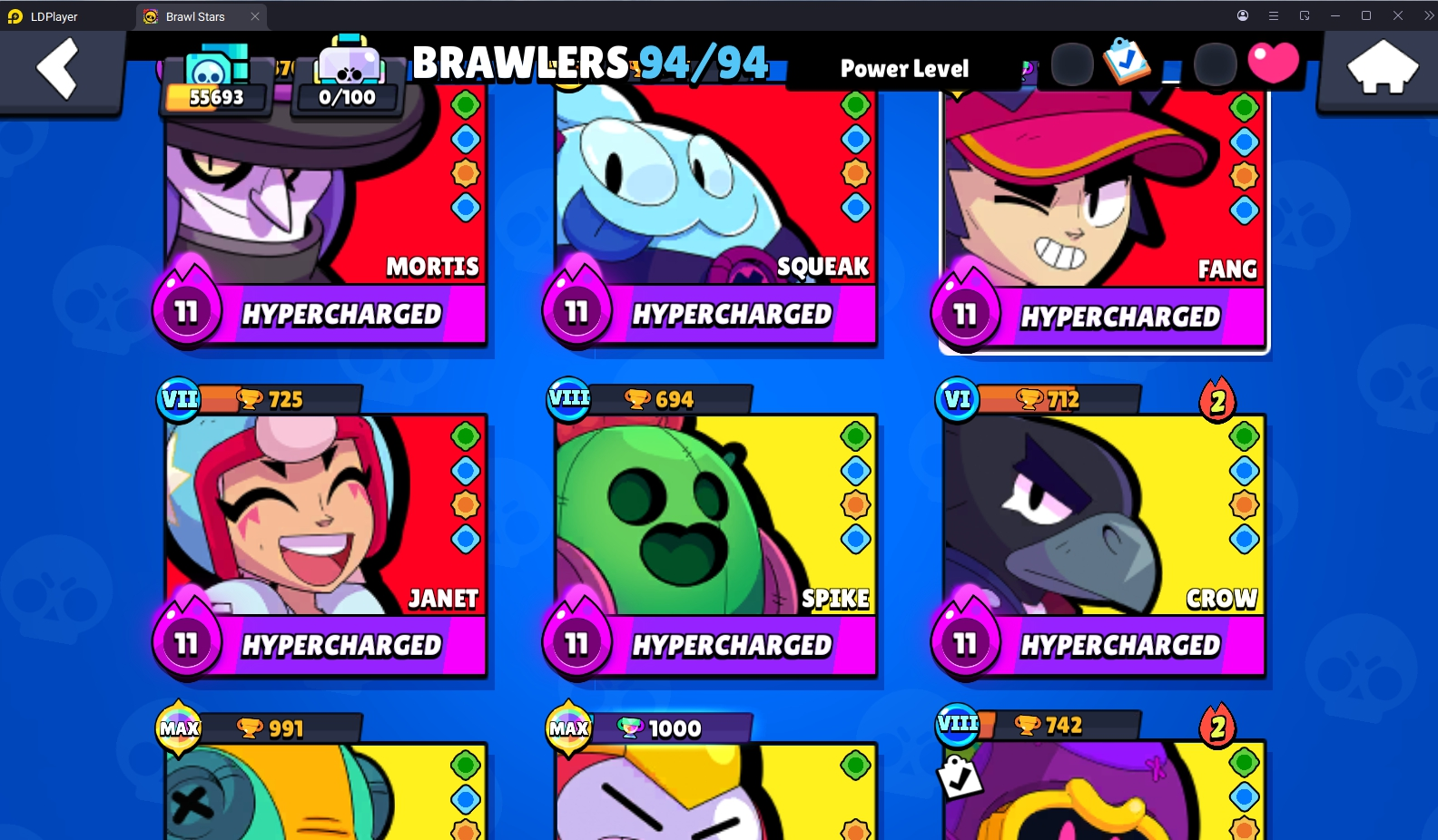 228 SKINS 💯 55.693 TROPHIES 🏆 94 BRAWLERS 🐼 22 HYPERCHARGED 🩸 26 MAX BRAWLERS 💛 NIGHT MECHA CROW 🧡 FURIOUS FANG 🧡 STELLAR SHELLY 🧡 CURSED KENJI 🧡 ODIN CORDELIUS 💯