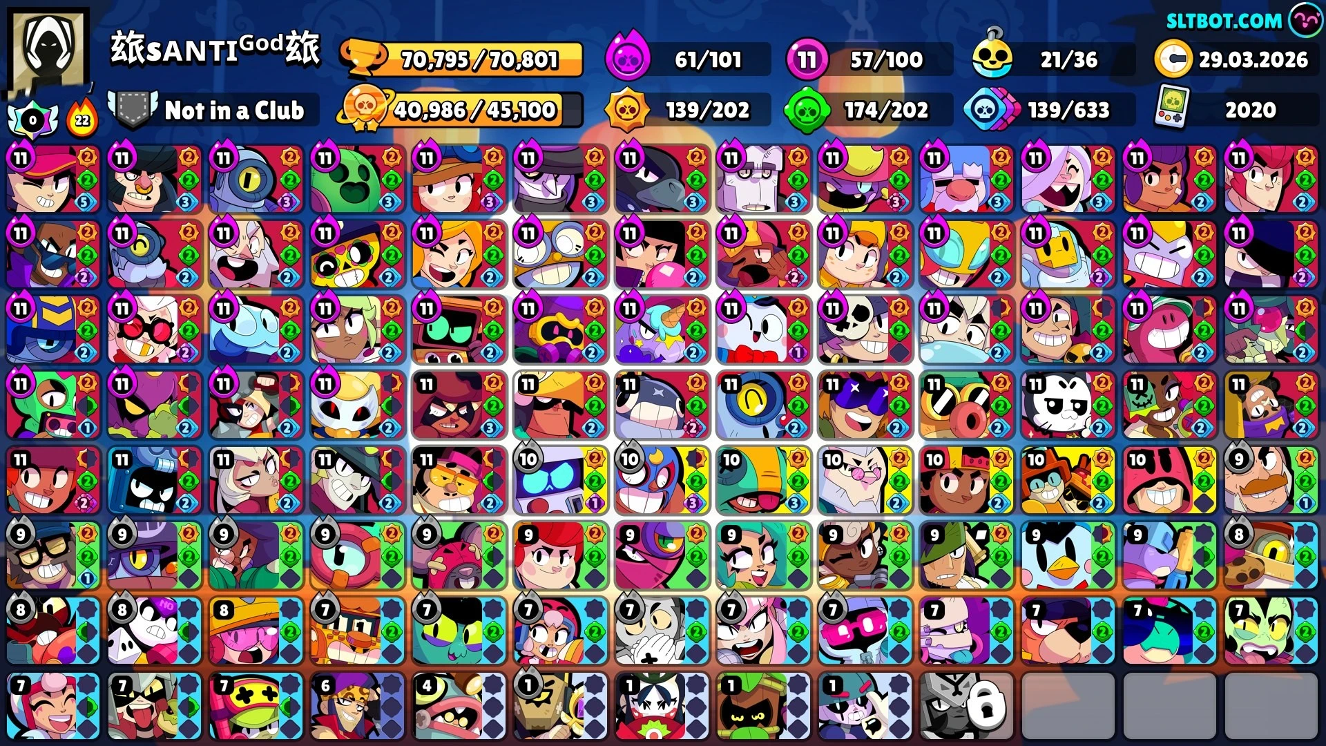 316 SKINS 💯 70.795 TROPHIES 🏆 100 BRAWLERS 🐼 43 HYPERCHARGED 🩸 42 PRESTIGE 💜 57 MAX BRAWLERS 💛 21 BUFFIES 🔑 BELLE GOLDHAND 🧡 KING LOU 🧡 MECHA PALADIN SURGE 🧡 ONI KENJI 🧡 DEMON MORTIS 💯 60K 70K