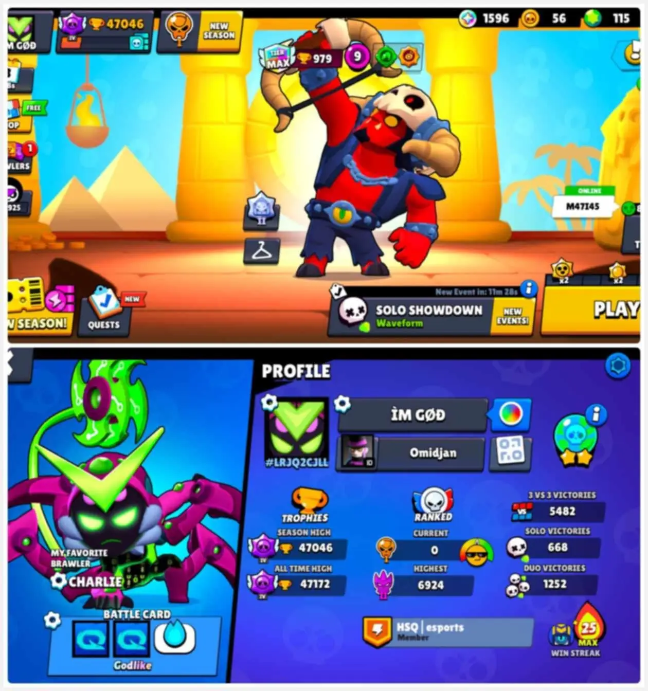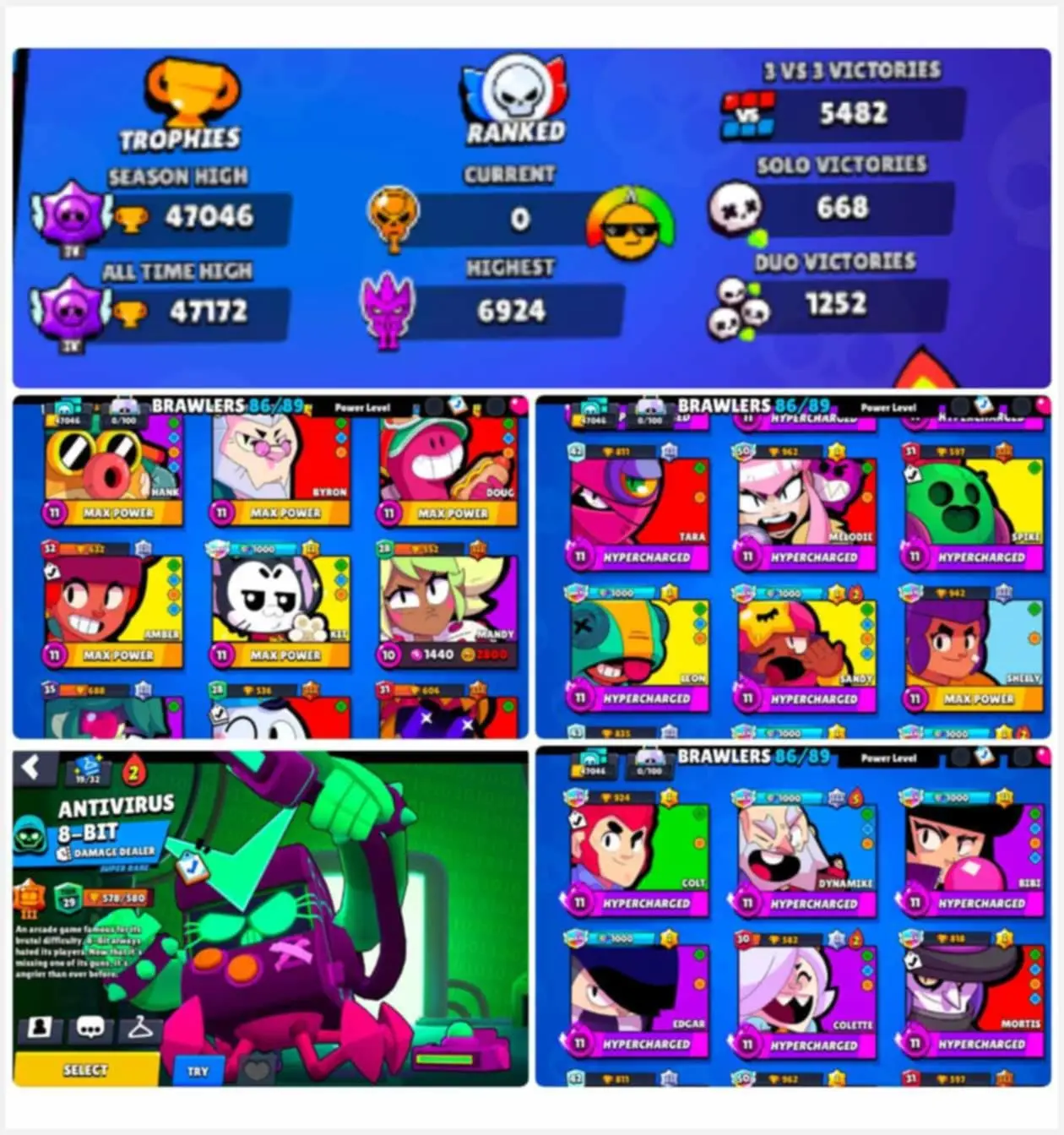 47K+TROPHY BEST 💥 86 BRAWLER 💥 11 HYPER 6 MAX TOTAL 17 MAX💥 157 SKIN ⸱ ANTRI VIRUS ⸱ VIRUS CHARLIE 💥 CHEACHEAP✨ INSTANT