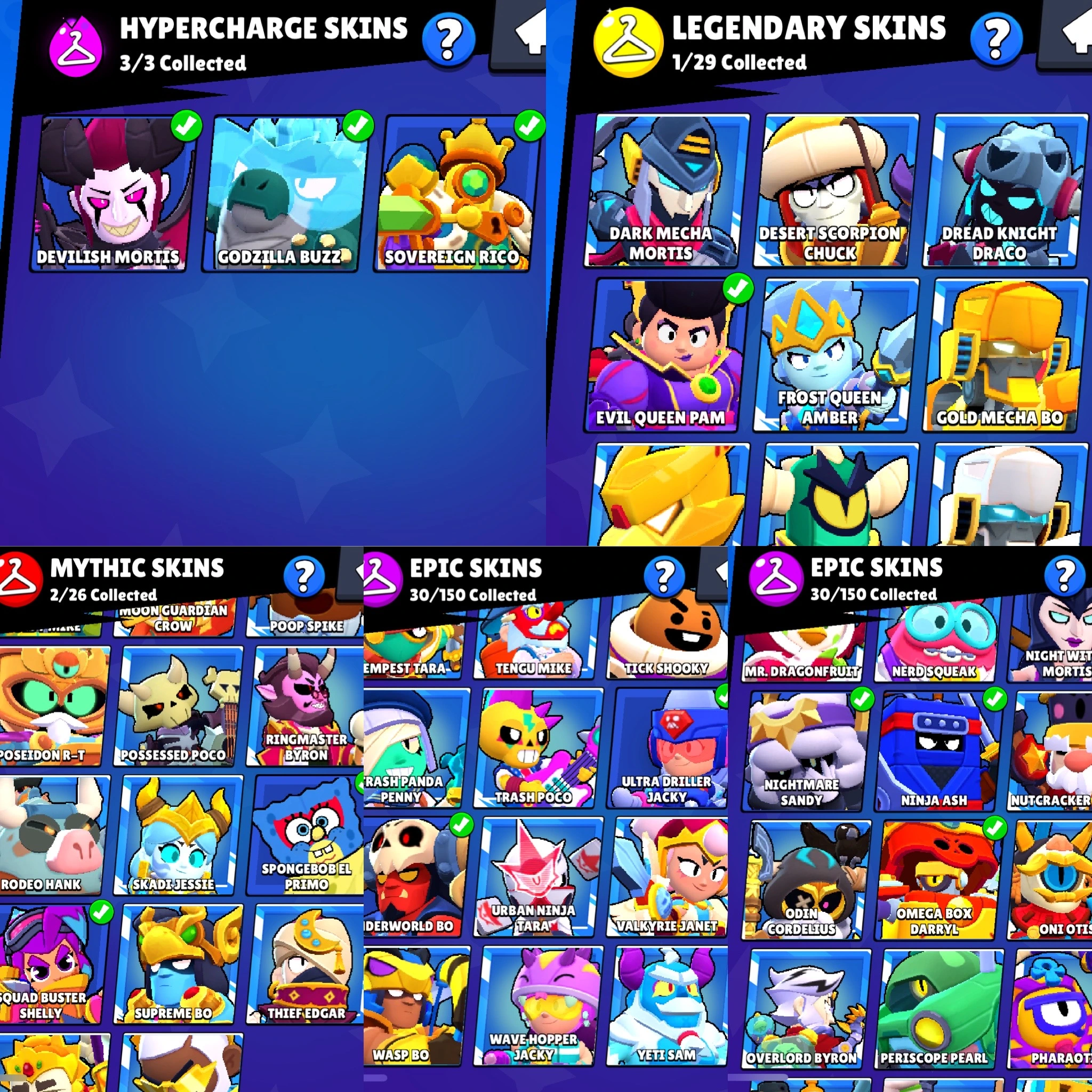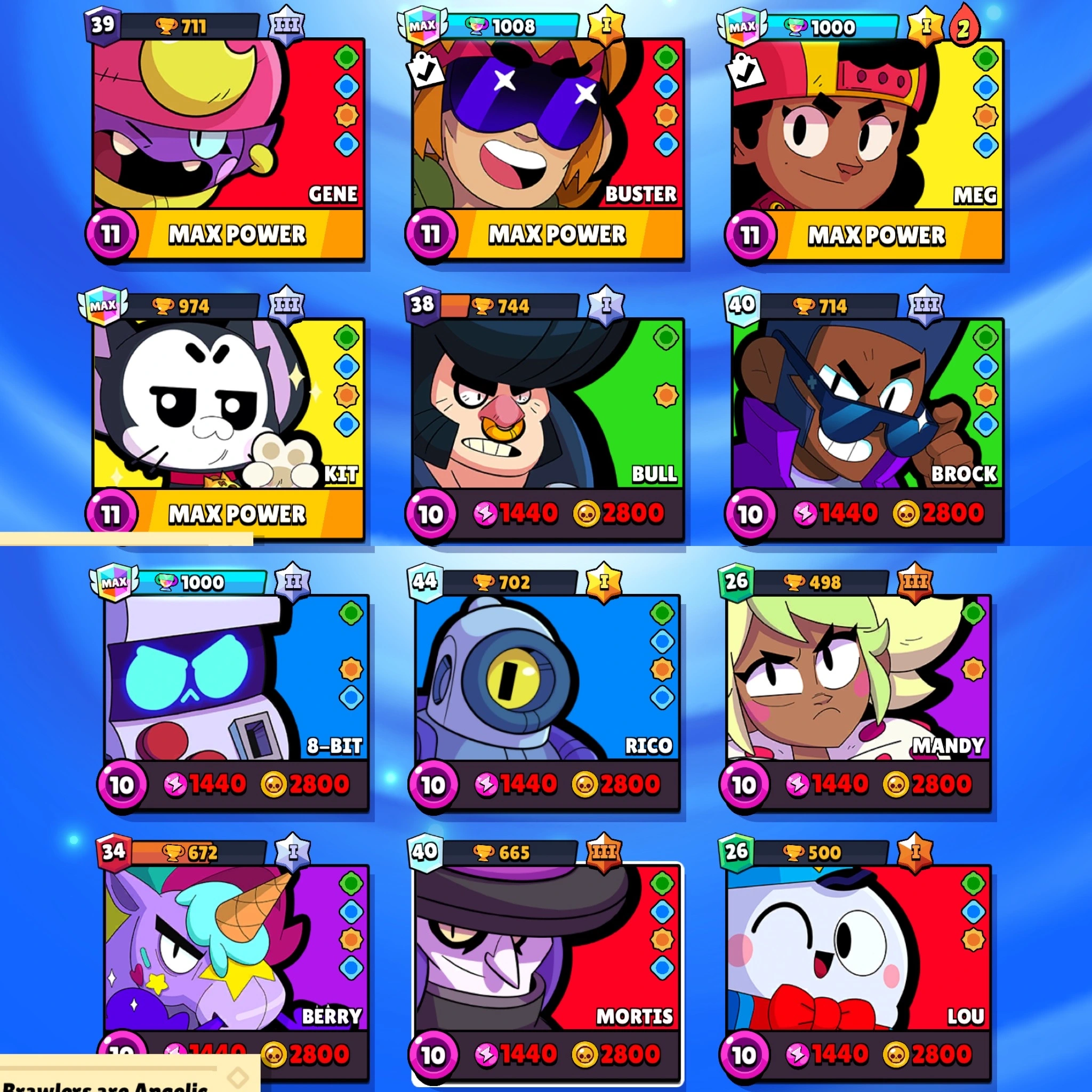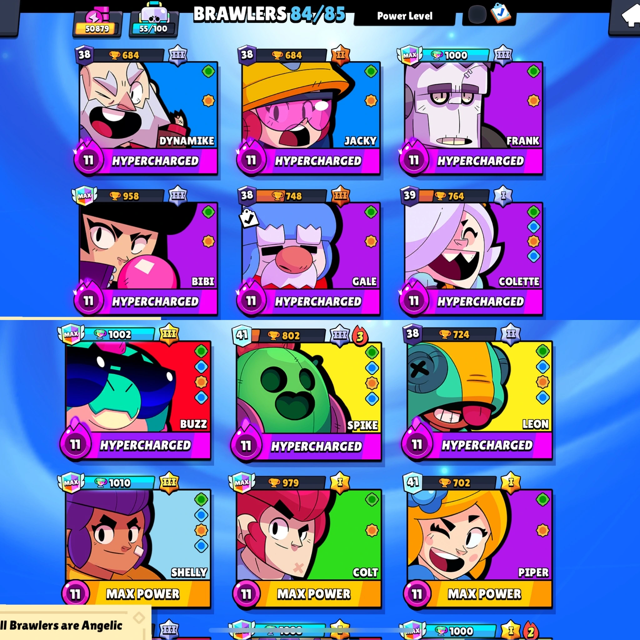 50.8k Trophy ✅ Hypercharged ⸱ Dynamike , Jacky , Frank , Bibi , Gale , Colette , Buzz , Spike , Leon ✅ Max ⸱ Shelly , Colt , Piper , Gene , Buster , Meg , Kit #B349