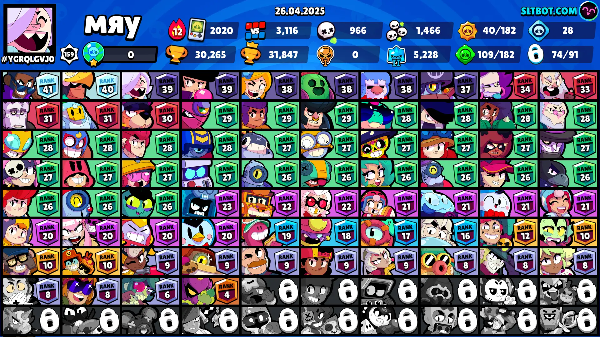 57 SKINS 🩵 30.750 TROPHIES 🏆 74 BRAWLERS 🧸 2 HYPERCHARGED 🩸 9 MAX BRAWLERS 🩷 FILMMAKER BUZZ 🩵 PHARAOTIS 🩵 CLASSIC DYNAMIKE 🩵 B-800 🩵 REBEL LOLA 🩵 SPIKY EVE 🎀