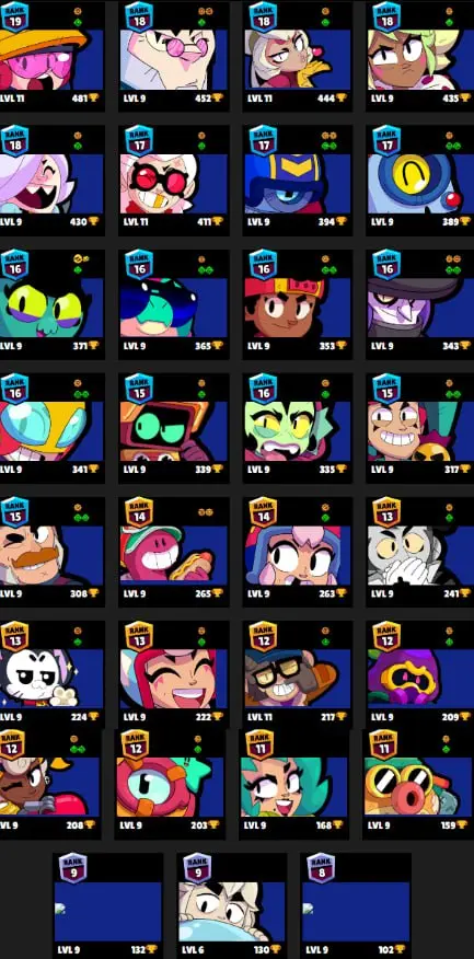 ๐ 79 Brawlers ๐ 33.345 Trophies ๐ 90 Skins ๐ 10 Legends ๐ 25 Mythics ๐ 25 Epics ๐ 7745 Gold ๐ 147 Gems ๐ 6873 Blings ๐