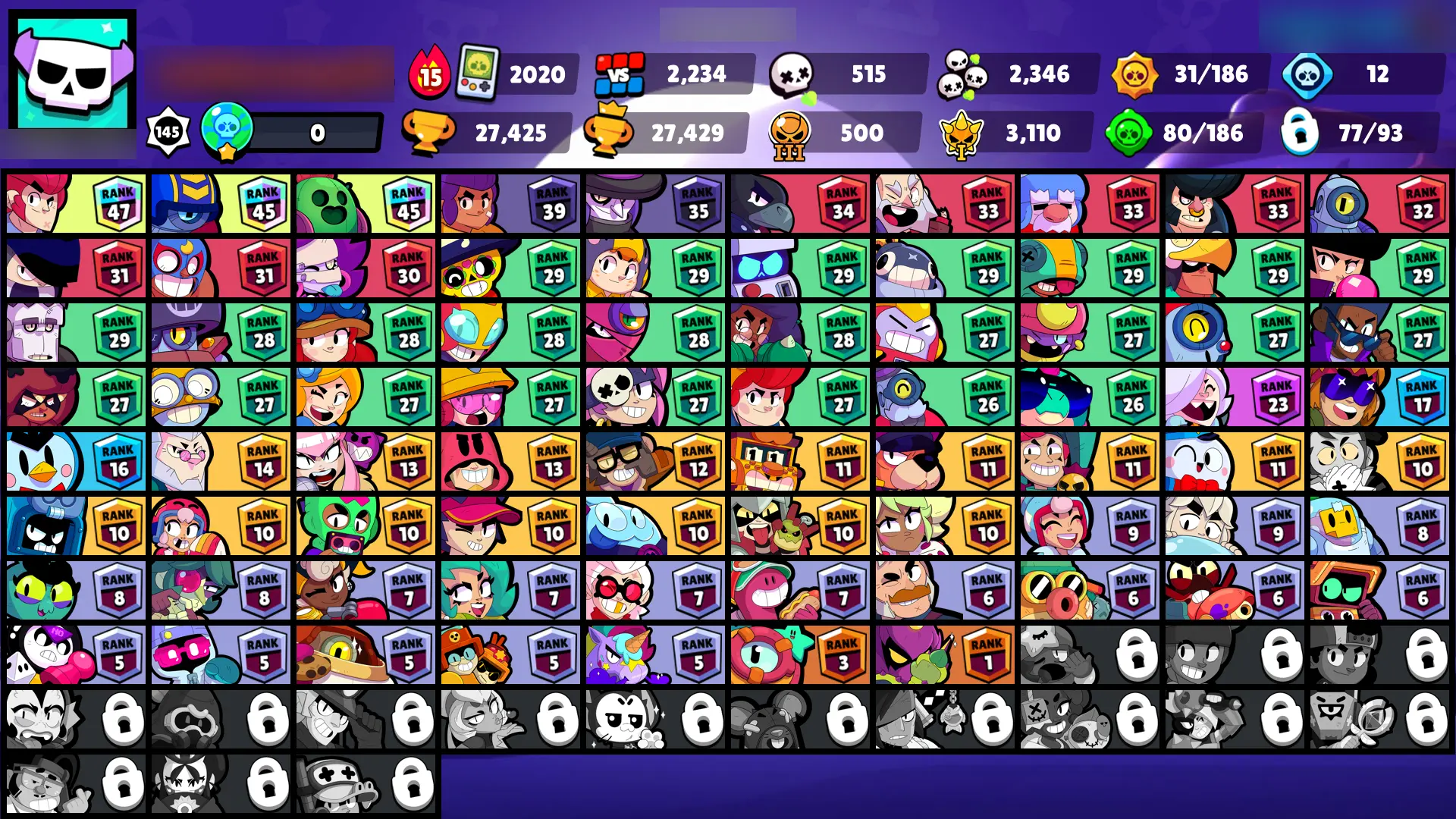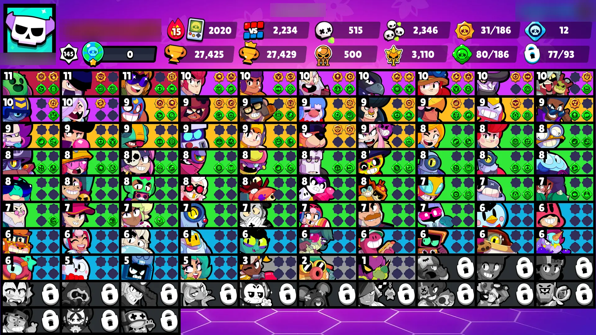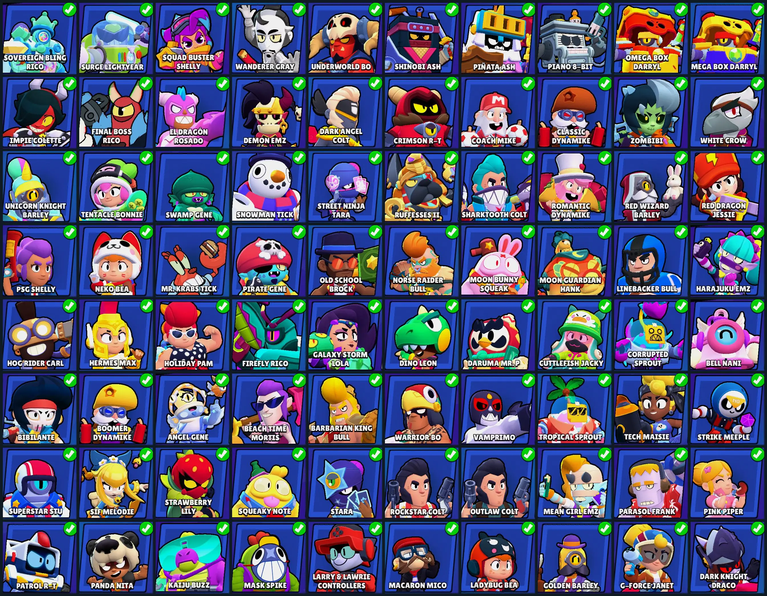 92 SKINS | 27425 TROPHIES | HERMES MAX | SURGE LIGHTYEAR | WARRIOR BO | UNDERWORLD BO | PIANO 8-BIT | IMPIE COLETTE | SHINOBI ASH | GALAXY STORM LOLA | TECH MAISIE | ANGEL GENE | PIRATE GENE | MOON GUARDIAN HANK | RUFFESSES II | CRIMSON R-T | 77 BRAWLERS