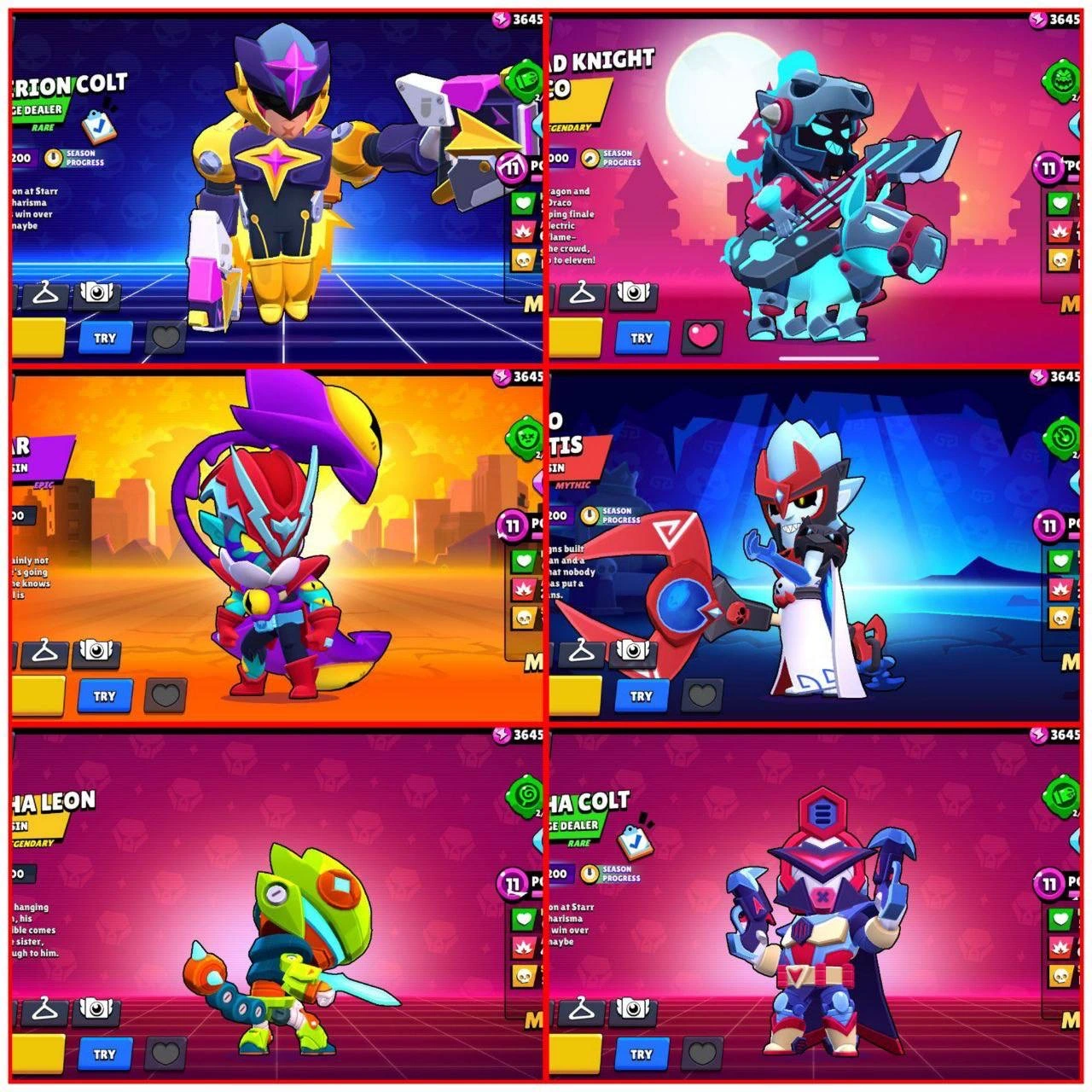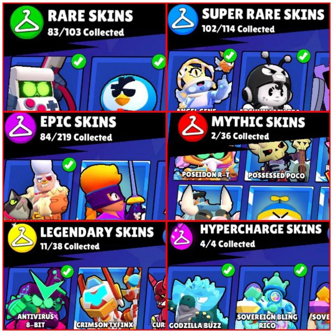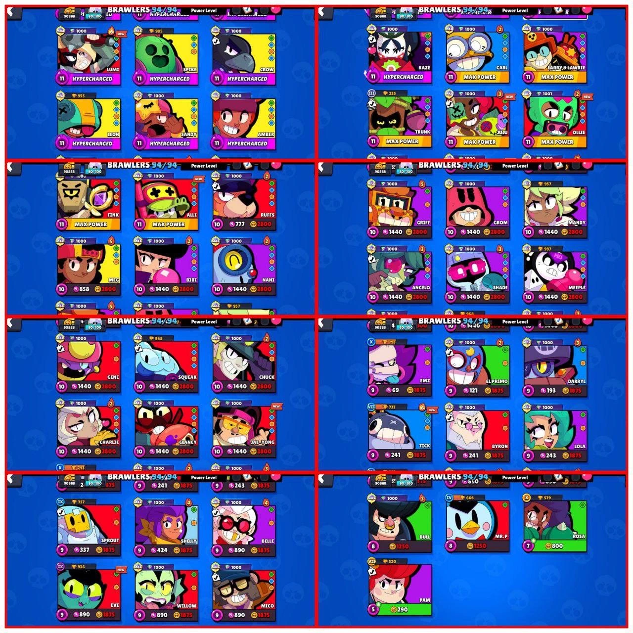 93500+ TROPHIES 💥 HYPNOS SANDY, ONI KENJI, HYERPION COLT 💫 62 MAX POWER BRAWLERS ⭐️ 55 HYPERCHARGED ⚡️ SOLAR FAME 2 🌊 DREAD KNIGHT DRACO, DRIFT EDGAR, MECHA LEON, HADES MORTIS, MECHA COLT ✨ 290 TOTAL SKINS 🥂 25 TITLES 💥 -118 GEMS (NEGATIVE)